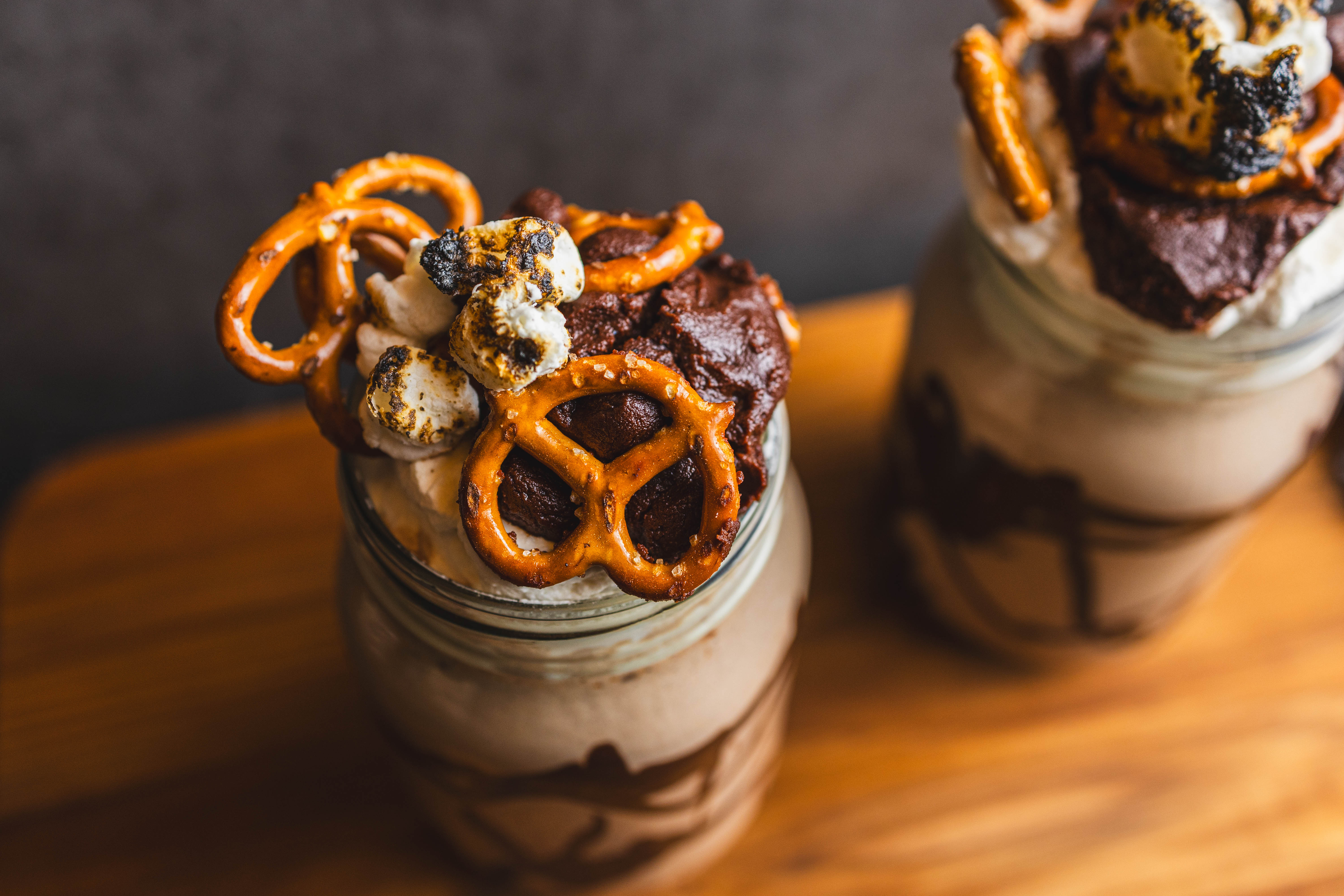 Step 17 -Top each milkshake evenly with the malted whipped cream, a square of the Nutella-pretzel fudge, and a toasted marshmallow.