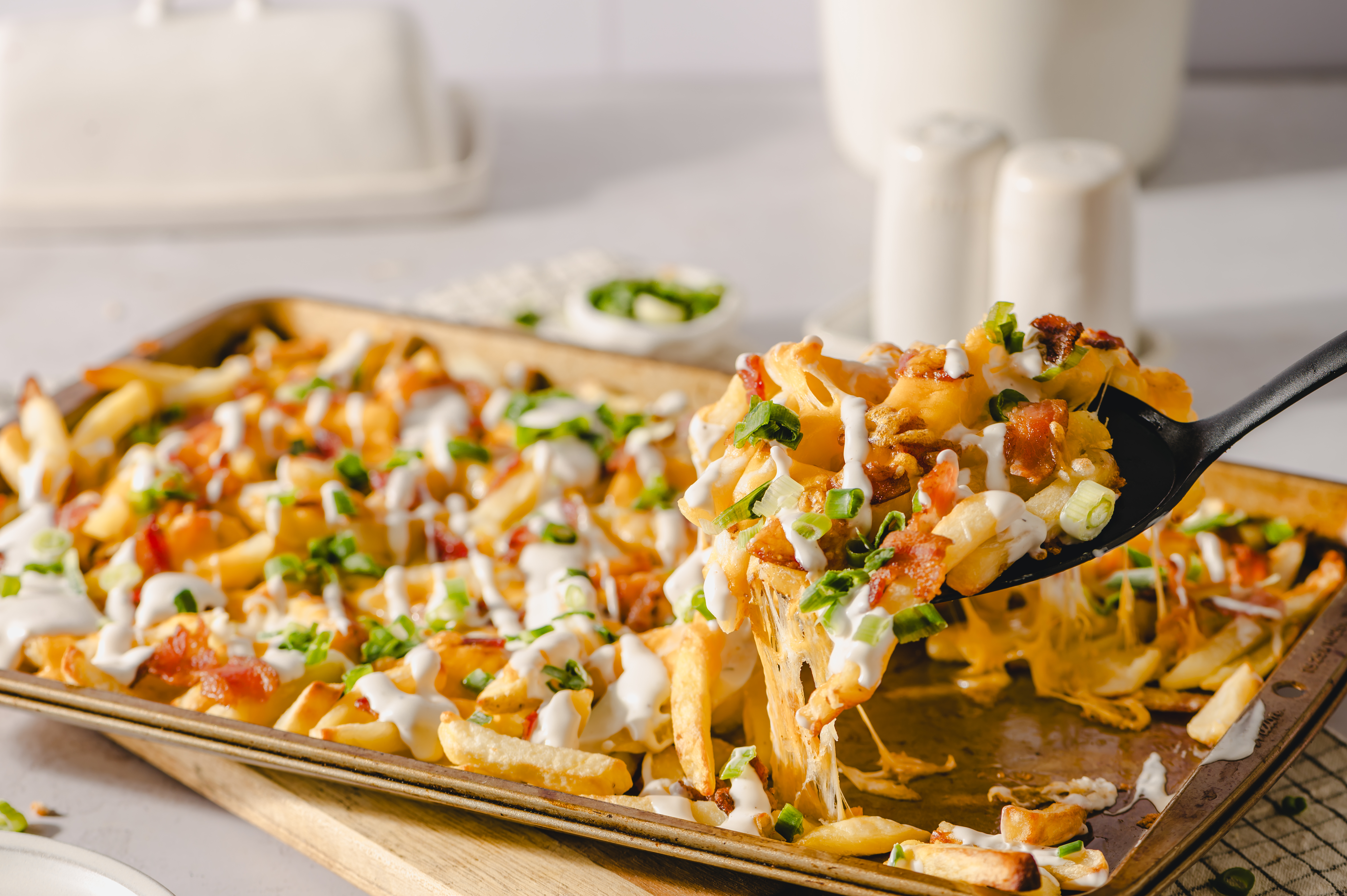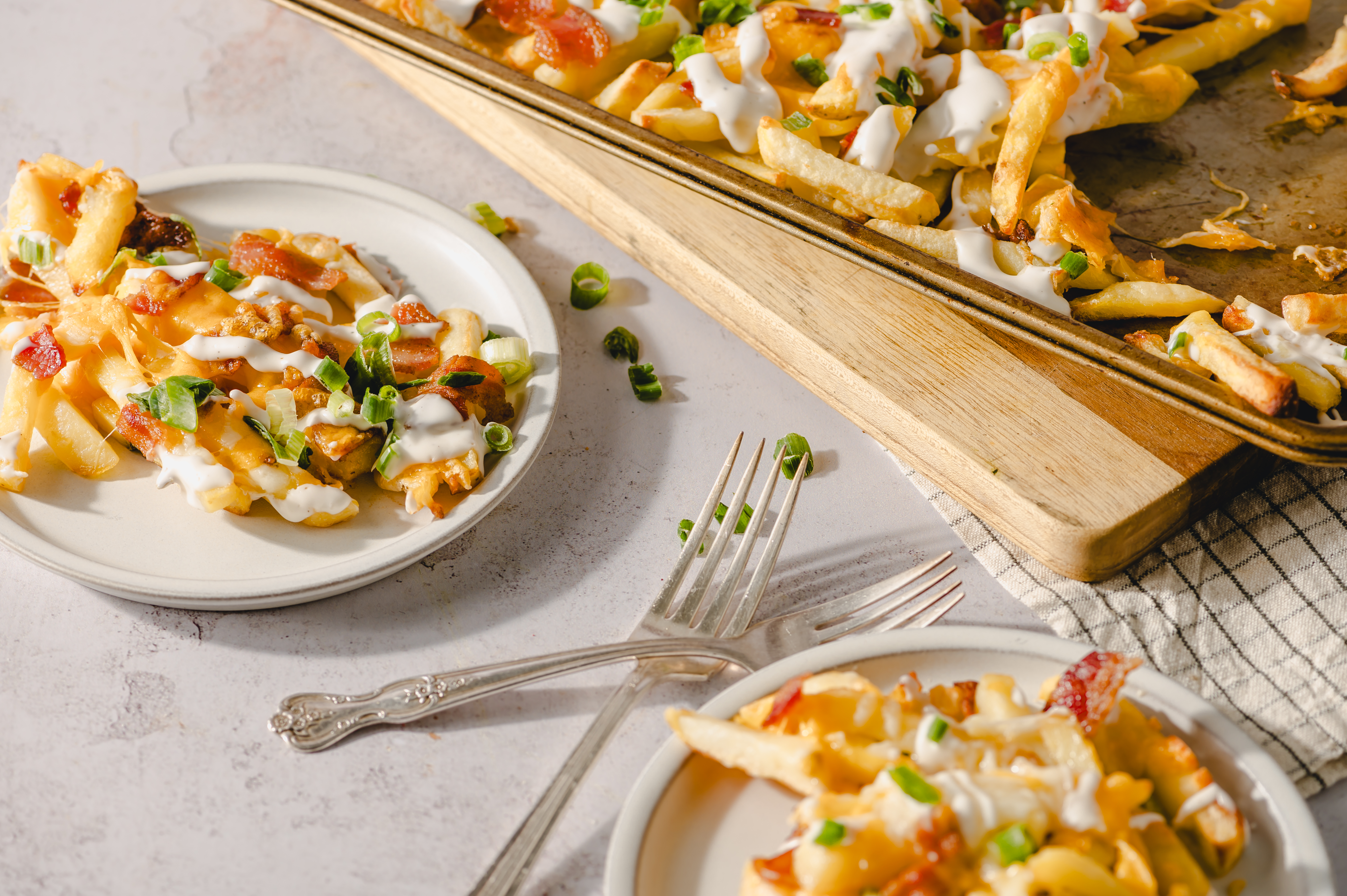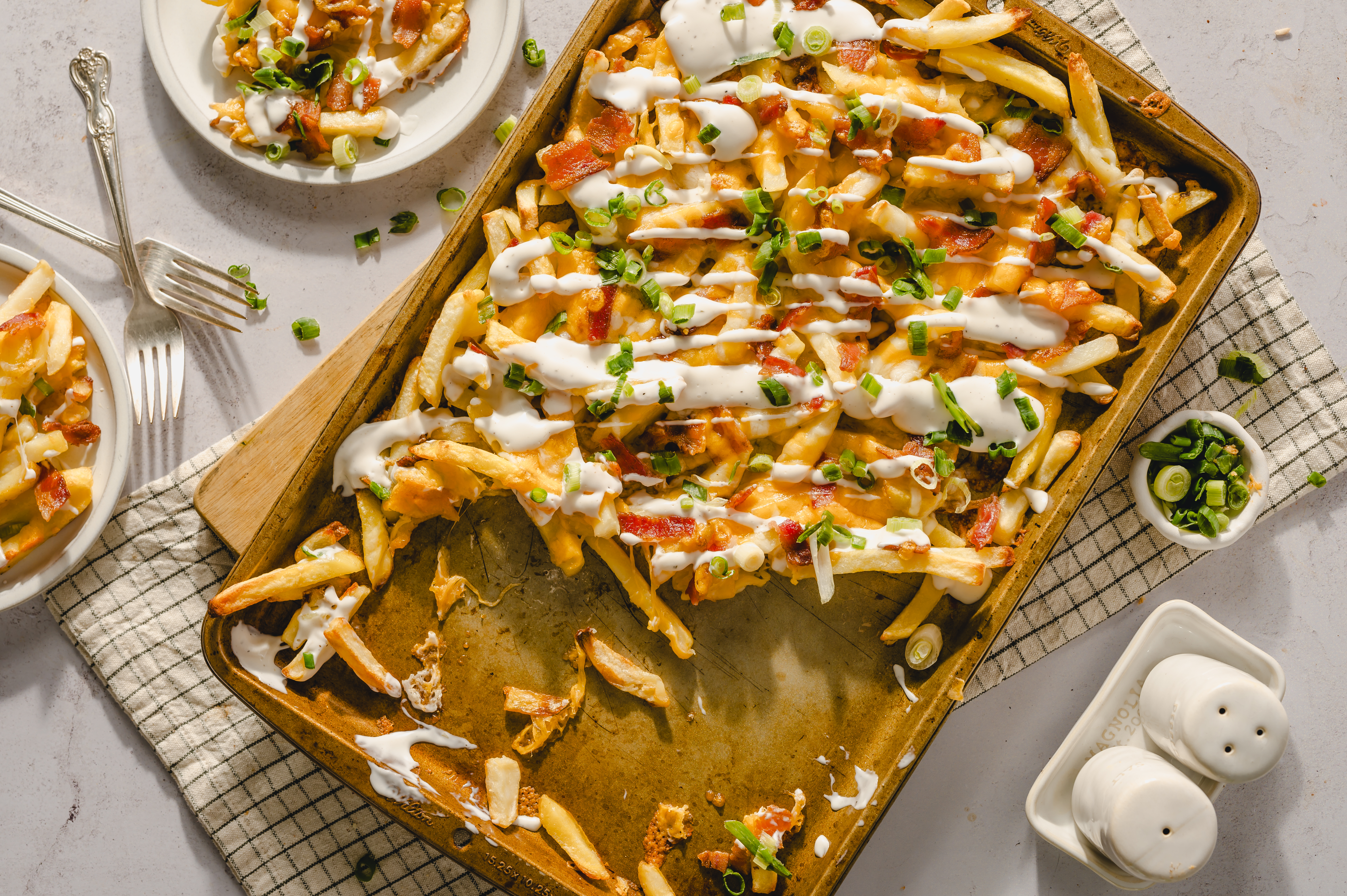 Snackers rejoice! We can't possibly think of a better way to get your munch on. These crispy, homemade fries are double-fried and immaculately coated in a savory seasoning that you'll be licking off your fingers. Oh, and it doesn't stop there. They're loaded up with melty cheese, crispy bacon, and a drizzle of zesty, tangy ranch dressing for bite after bite of snackin' satisfaction. Yummy! These One-Pan Bacon Ranch Fries are the bomb!