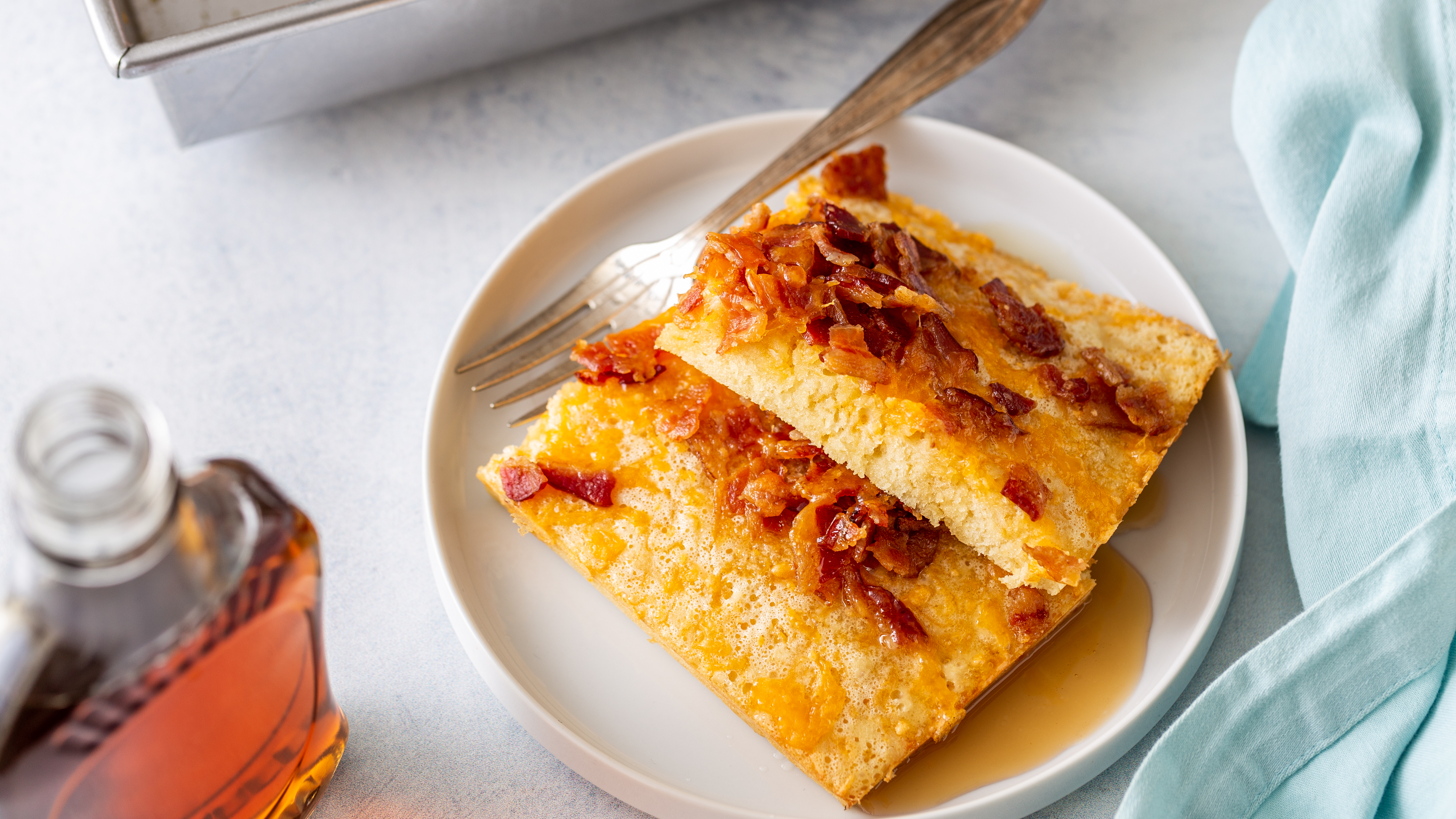 Whether you're hosting the next brunch bash or you're simply craving something sweet as the sun rises, this Pancake Casserole will make you excited to start another day! The beloved, fluffy, golden breakfast staple is cut into slices and sprinkled with salty, crispy bacon crumbles and melty cheese for the ultimate sweet and salty concoction. And of course, you can never forget the drizzle of the thick and rich maple syrup to add even more sweetness. Pancake Casserole will make your day feel like everything has already fallen into place... and who doesn't love that sensation first thing in the morning?!