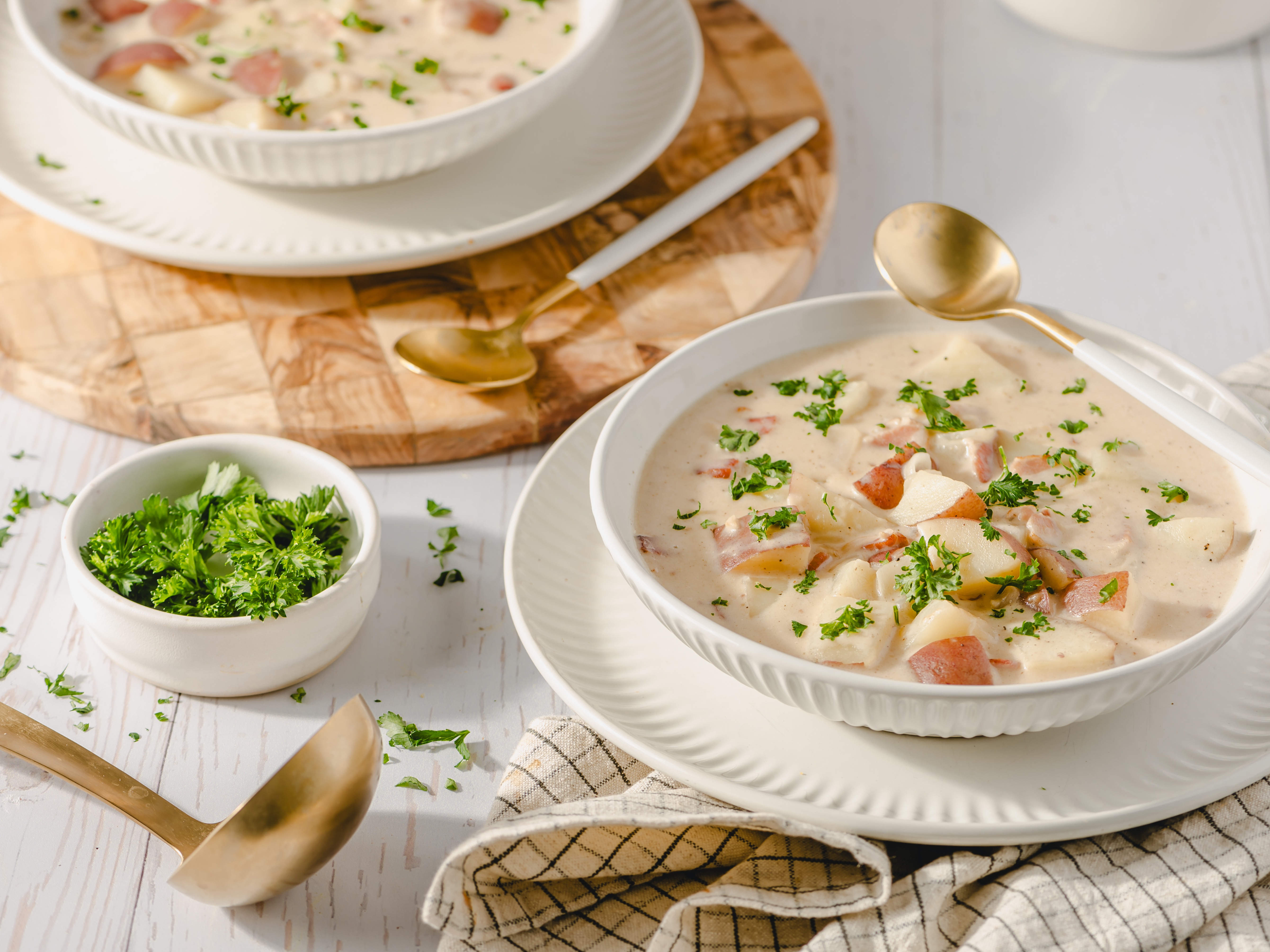 Papa's Potato Bacon Chowder is a rich and hearty soup perfect for warming up your bones and your soul on chilly days. Tender red potatoes are simmered in a broth of savory chicken stock and bright white wine. The broth is then infused with smoky bacon and sweet sautéed onions, with a touch of half-and-half to adds creaminess and richness, making this chowder a pure comfort. Each sip is like biting into the best loaded baked potato! Papa's Potato Bacon Chowder is a delicious way to enjoy the flavors of home when things get nippy outside! It's just like how Dad makes it... and maybe just a touch better!