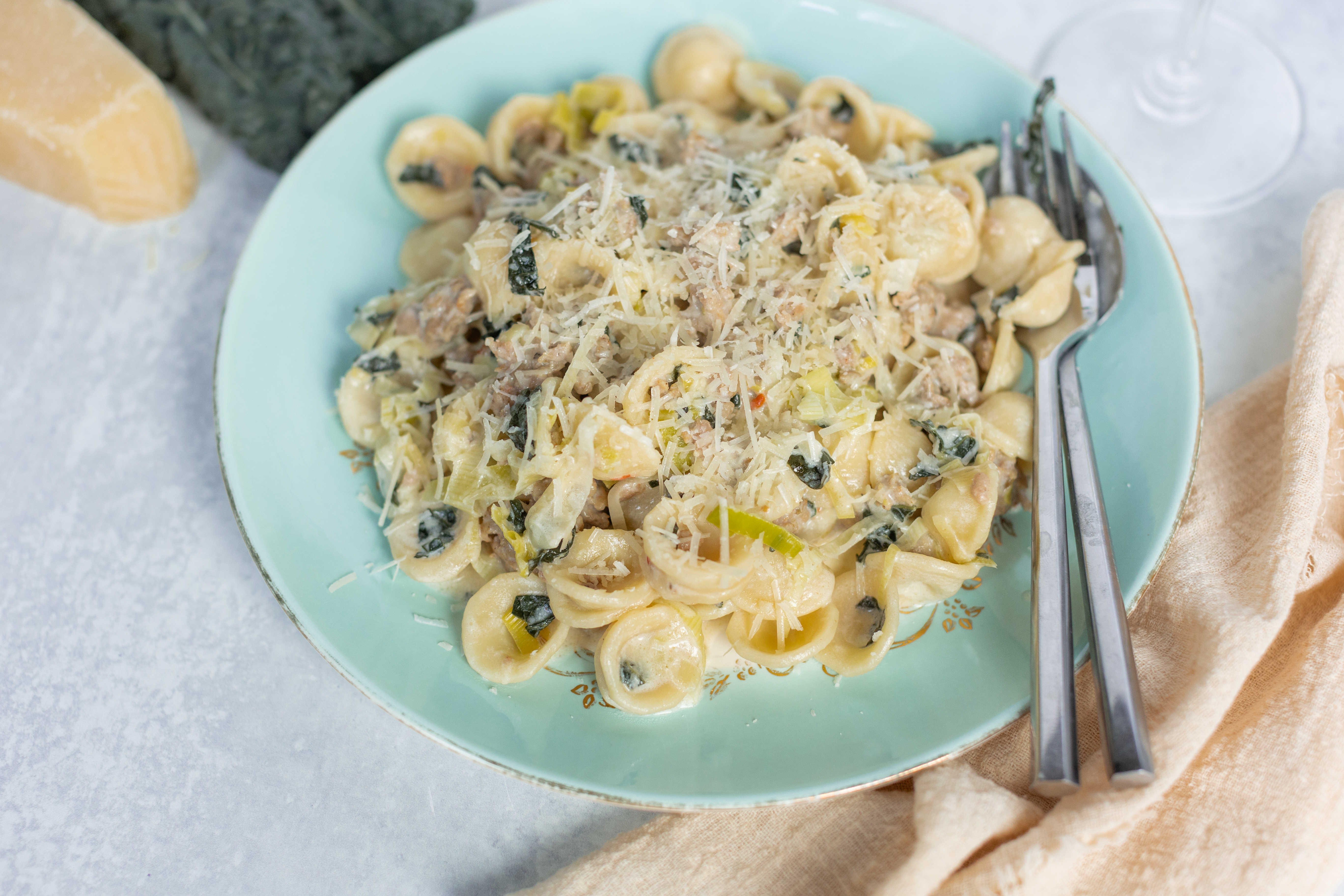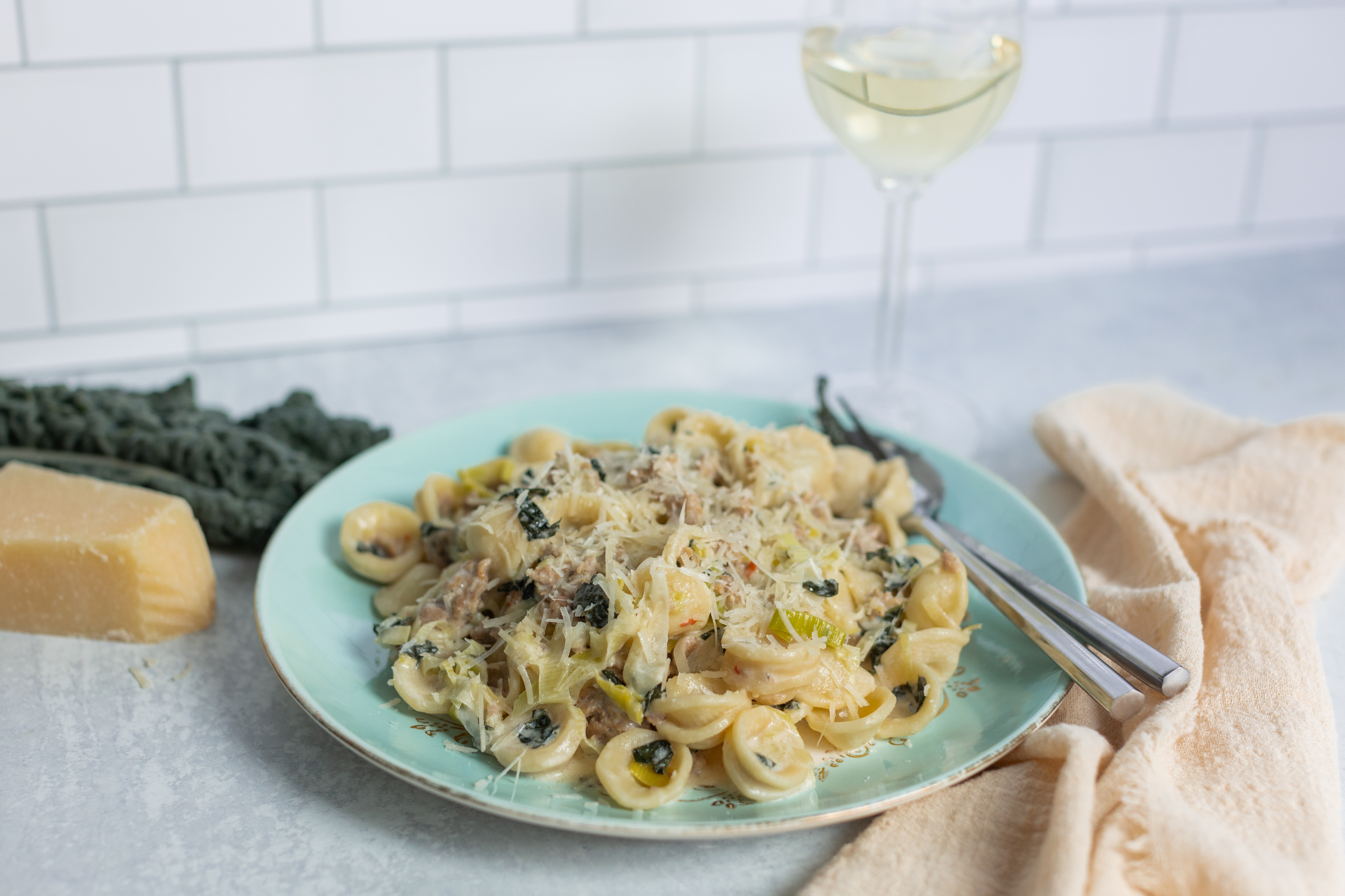 Practically perfect in every way! Yes, Perfect Pasta checks all the boxes, and with enthusiasm. Ready in just 30 minutes! Savory sausage and leeks in a white wine sauce! Sharp parmesanand Asiago sprinkled over the top of tender pasta! Check, check, check! It's perfect! Well, it has to be... or it wouldn't be called Perfect Pasta!