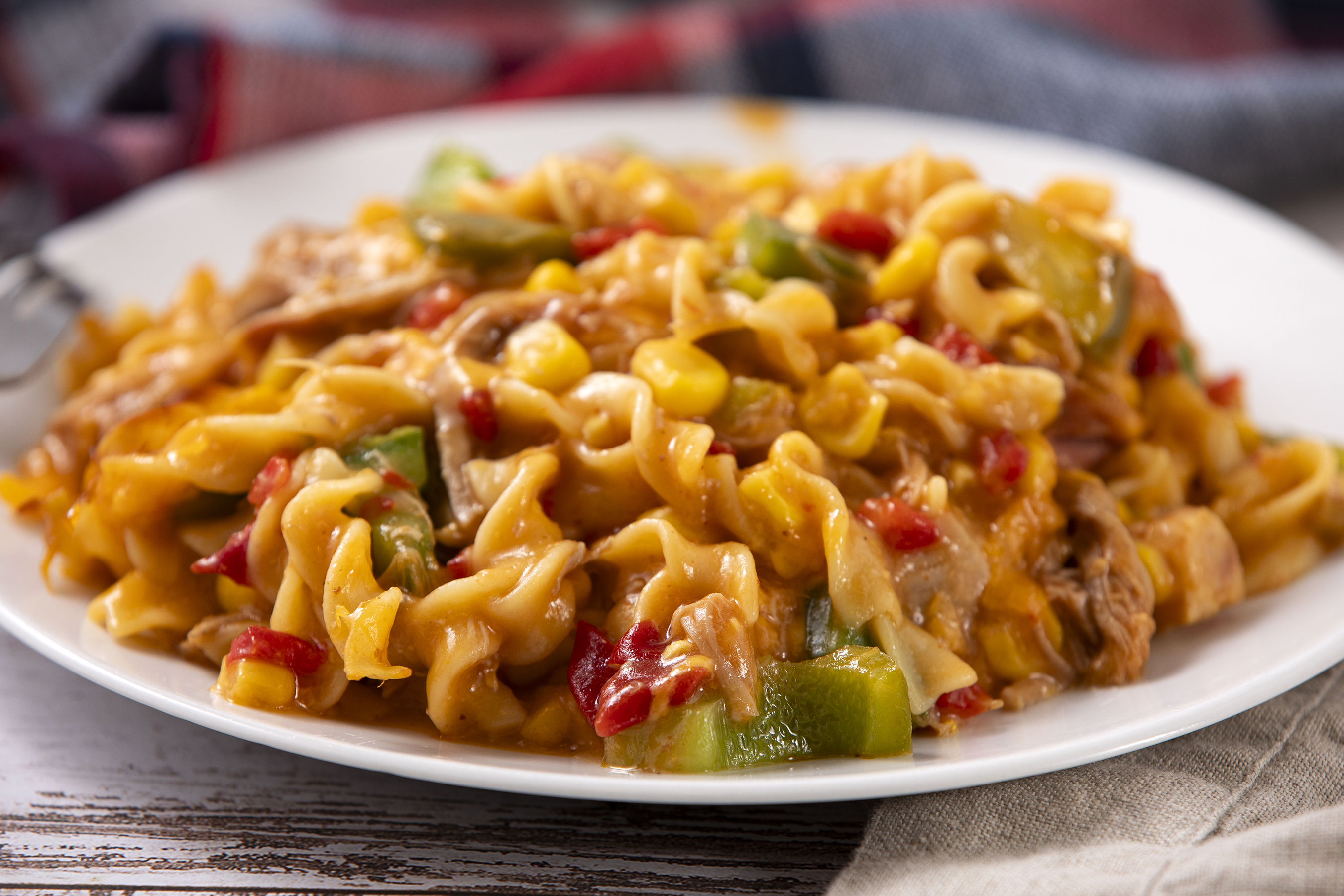 Cha-ching! The Piggy Bank Bake is a vault of flavors your taste buds will want to keep visiting! Tender egg noodles! Summery corn kernels! Spicy pimientos! Melty, sharp cheddar cheese! And succulent pork (that's right, the "piggy" isn't just a name)! Mmmm, all together, Piggy Bank Bake is an institution of flavor! Get your monocles on!