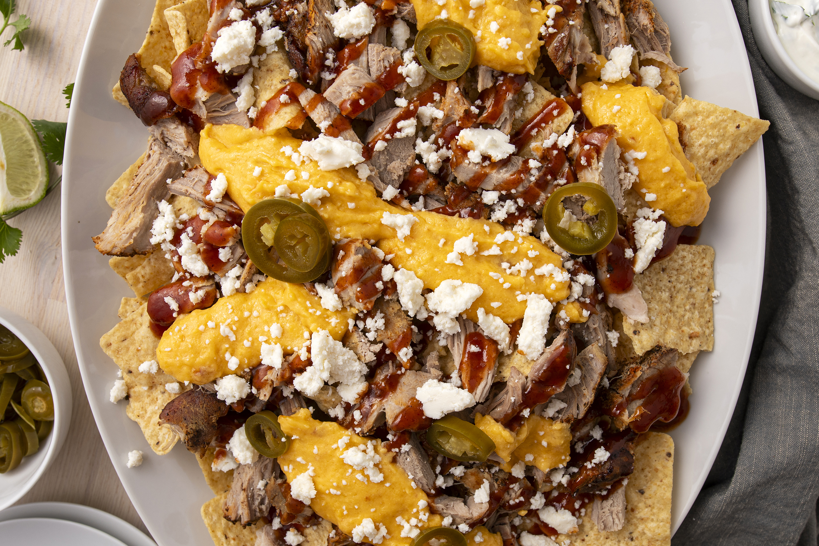 Step 15 -Add the warm pull pork, the barbecue sauce, the pickled jalapeños, and the queso fresco to the tortilla chips.