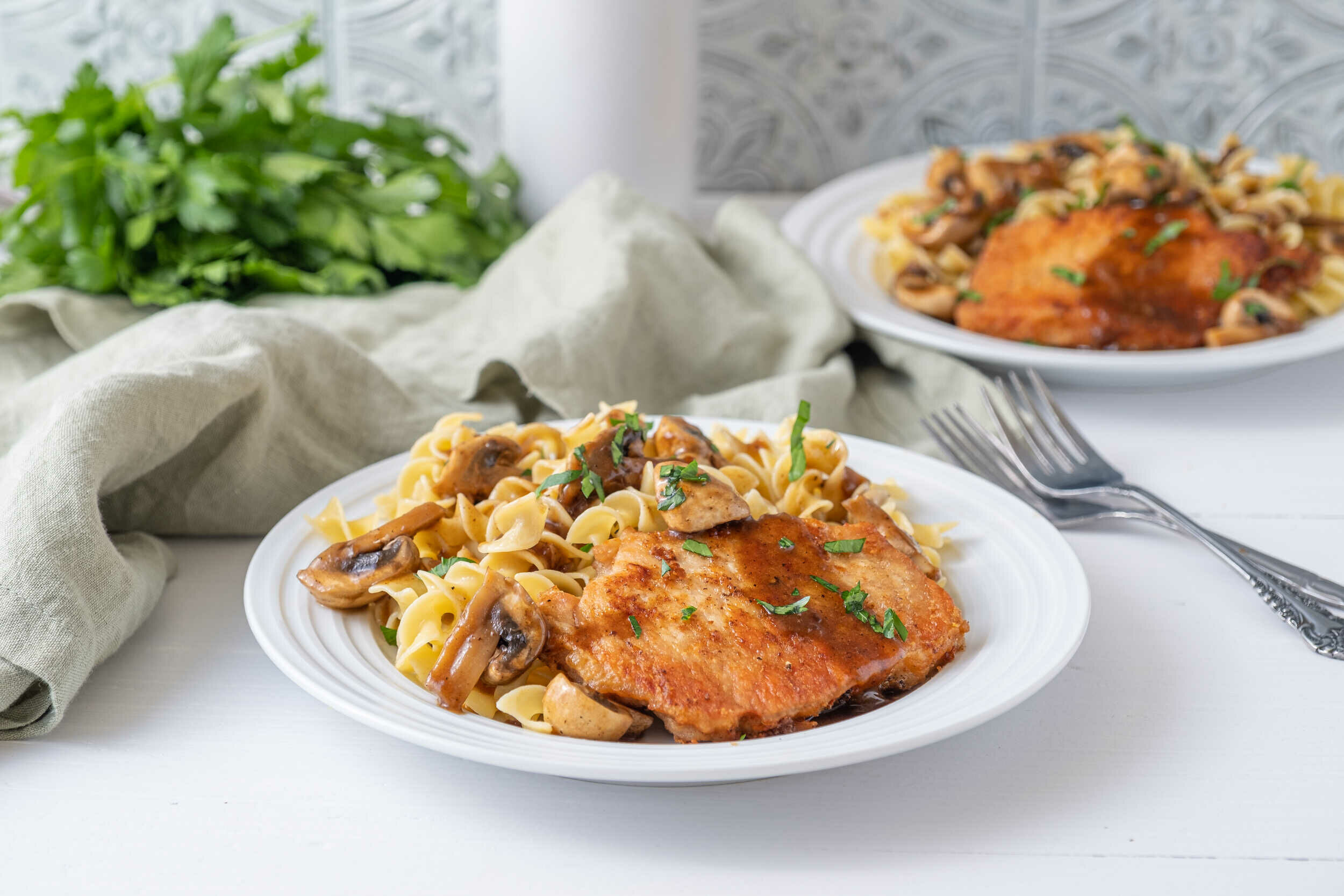Step 17 -Serve with buttered noodles, with the mushrooms and Marsala sauce on top and garnished with the parsley.