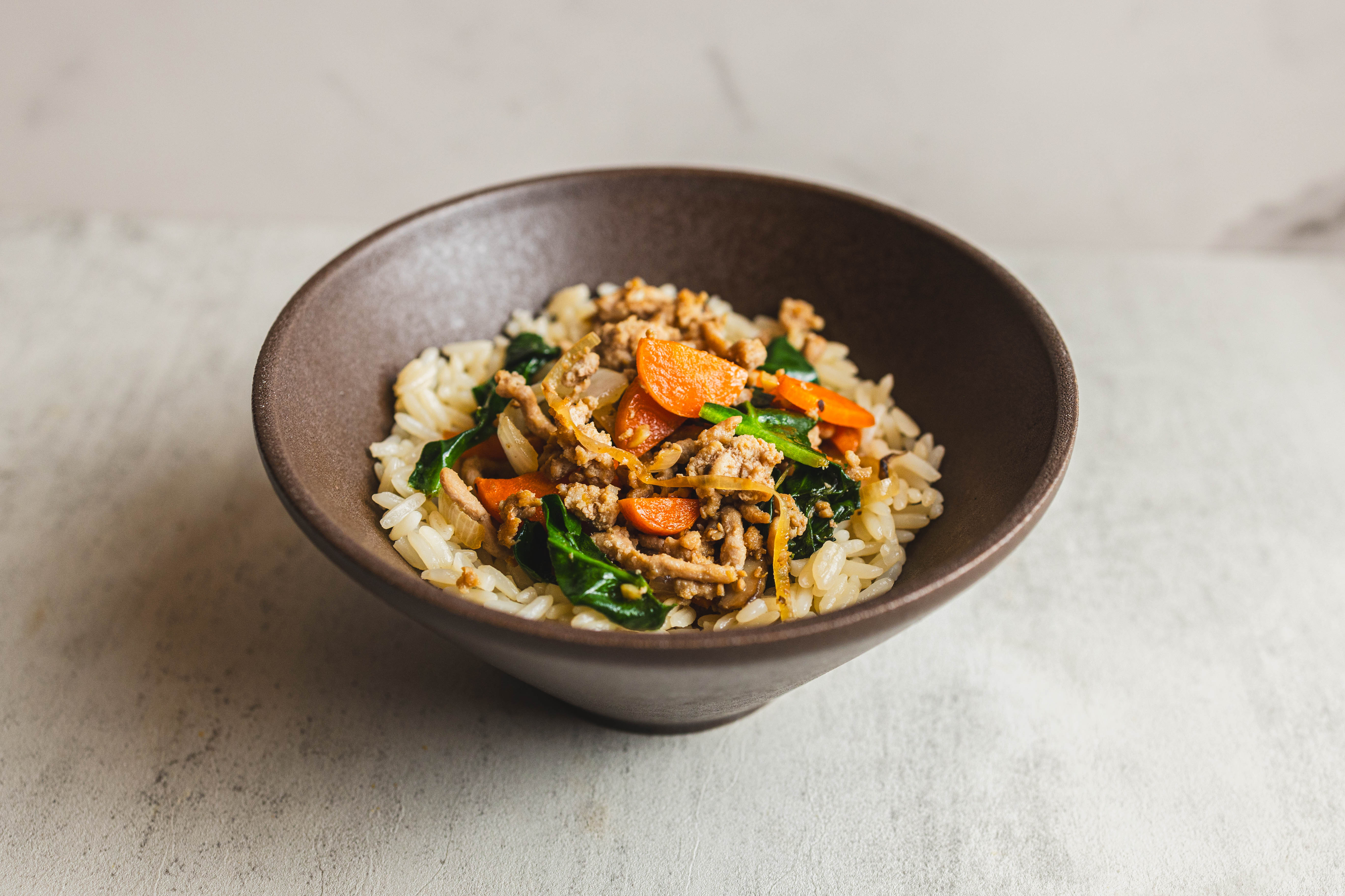 So, you're staying in tonight? Awesome! Usually, this would mean ordering takeout, but you can do better than that! Pork Stir-Fry For 1 will be ready faster than any delivery driver and will be tastier than anything that could come from a white box! Piled atop white rice are tender veggies with savory, succulent ground pork and a tangy and umami-packed sauce. An evening to yourself suddenly feels like a party with Pork Stir-Fry For 1 on the table!