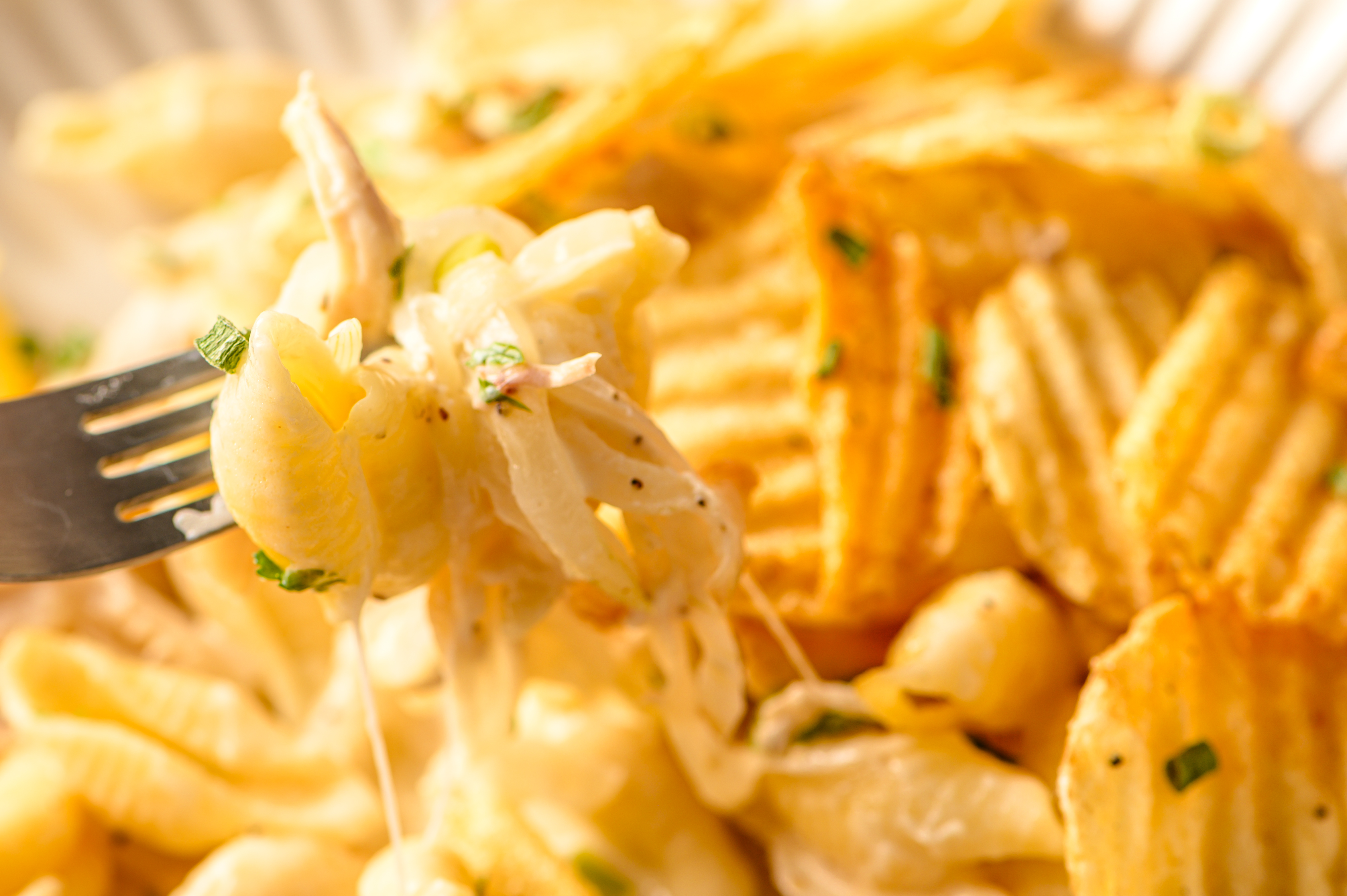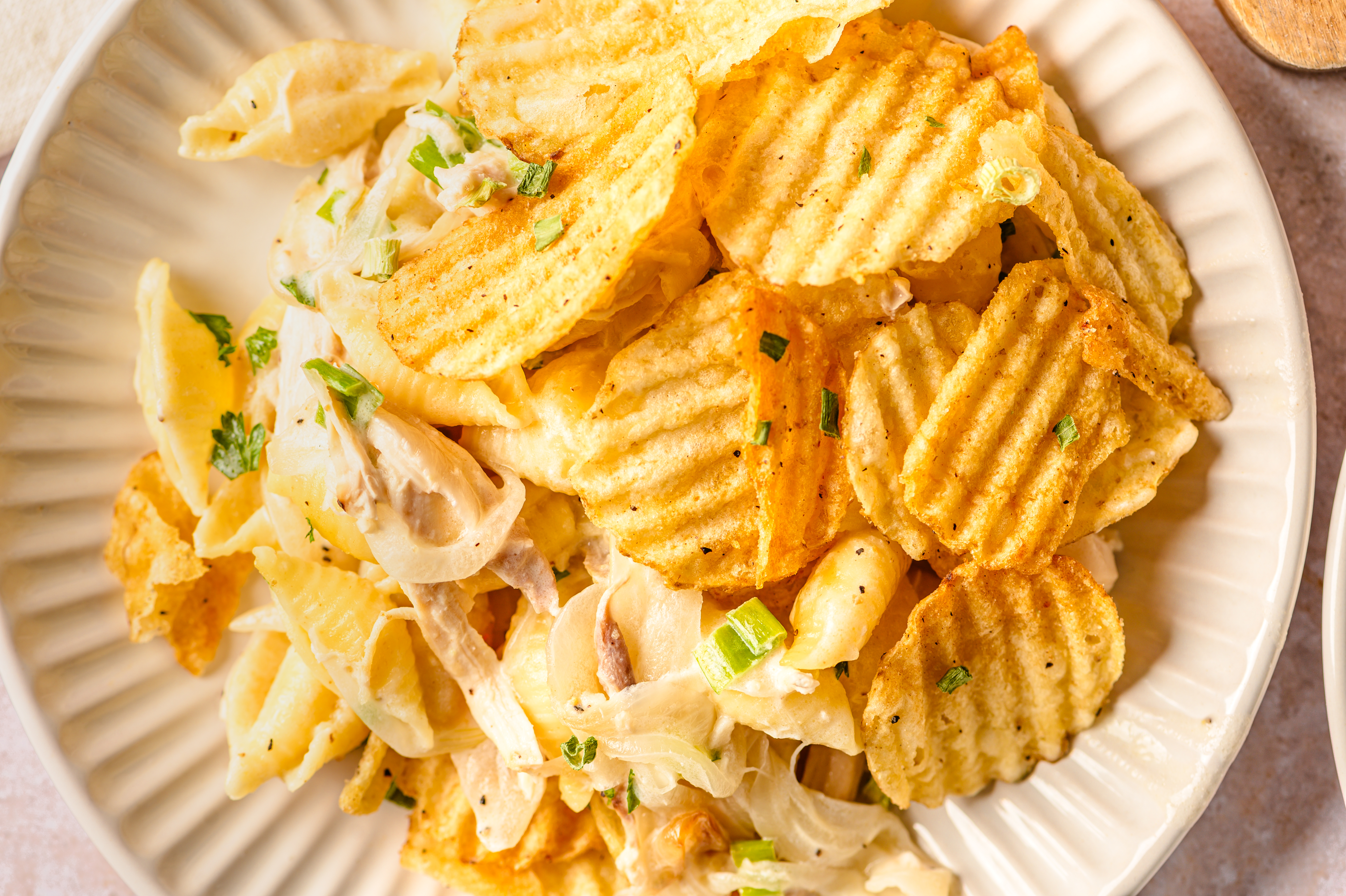 It's not just a name; Pure-Comfort Casserole is absolutely and undeniably pure comfort in dinner form! Golden caramelized onions and juicy, savory shredded chicken, mixed with tender pasta in a rich and creamy sauce will have lips smacking and forks scraping to get at every last morsel on your plate. Perhaps best of all, the topping is made of potato chips. What else do you need to know about Pure-Comfort Casserole? It's relaxation on a plate!