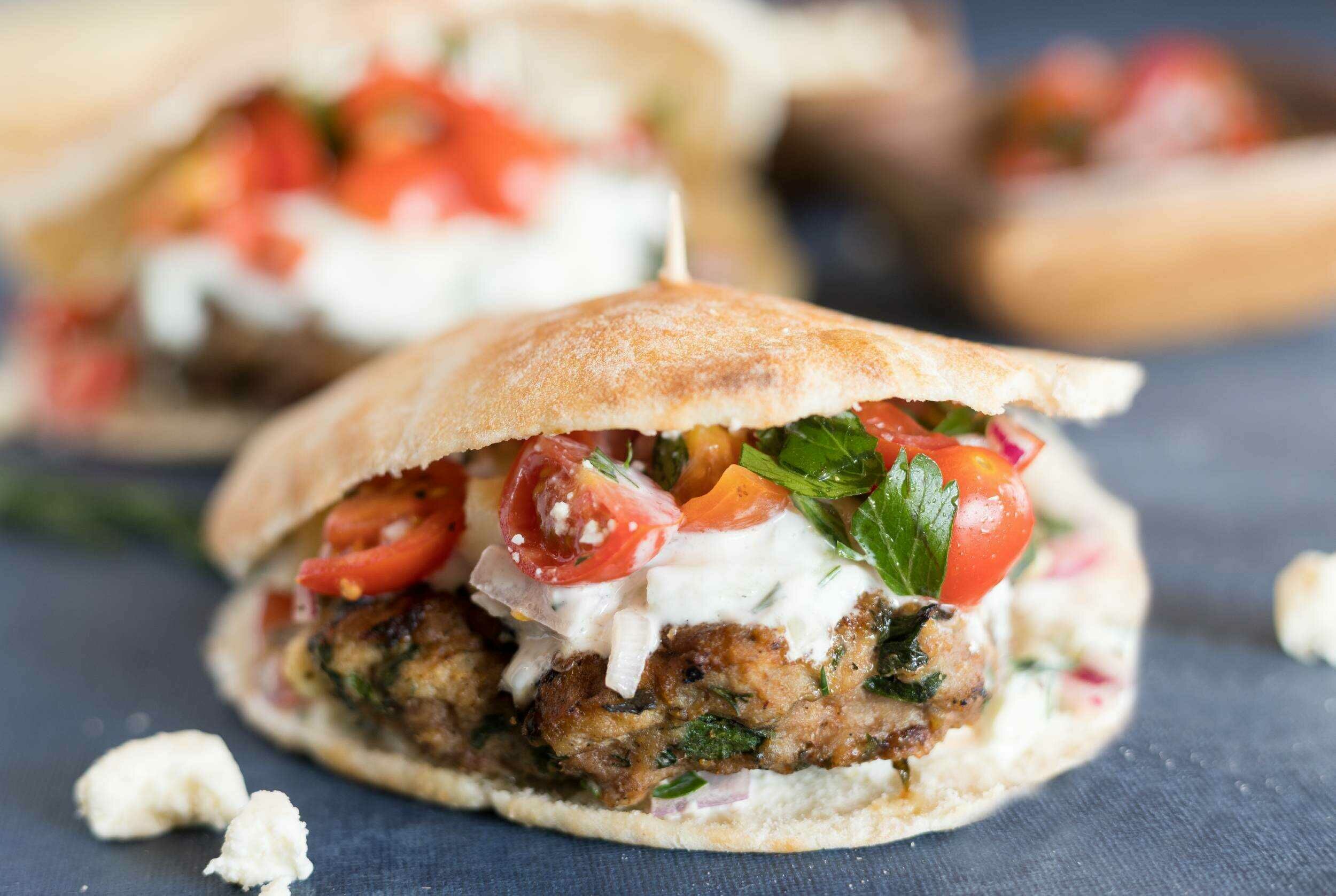 Step 13 -Serve the burgers in the pitas and topped with the tzatziki sauce and the Greek tomato salad.