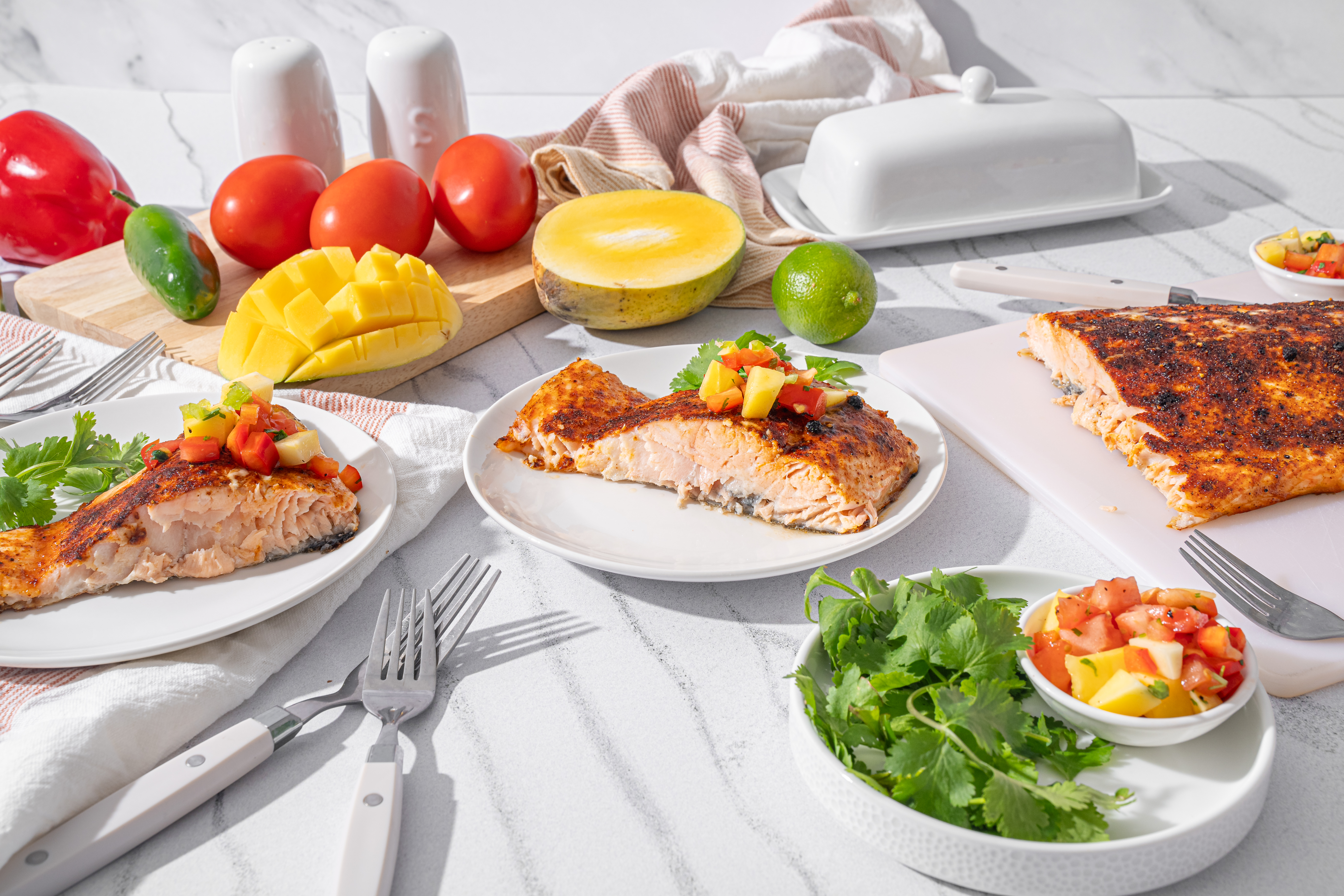 You are dreaming of a getaway, but everything is getting in the way. Don't despair! Let Seaside Salmon transport you to your happy place. A thick cut of salmon is dressed to the nines with a zesty dry rub and a refreshing splash of lemon-honey butter and baked until browned and tender. Then the hot and happening salmon joins the party with some mango salsa that will make your taste buds dance the night away. Join a new kind of vacation club with Seaside Salmon; the flavor party is always happening here!