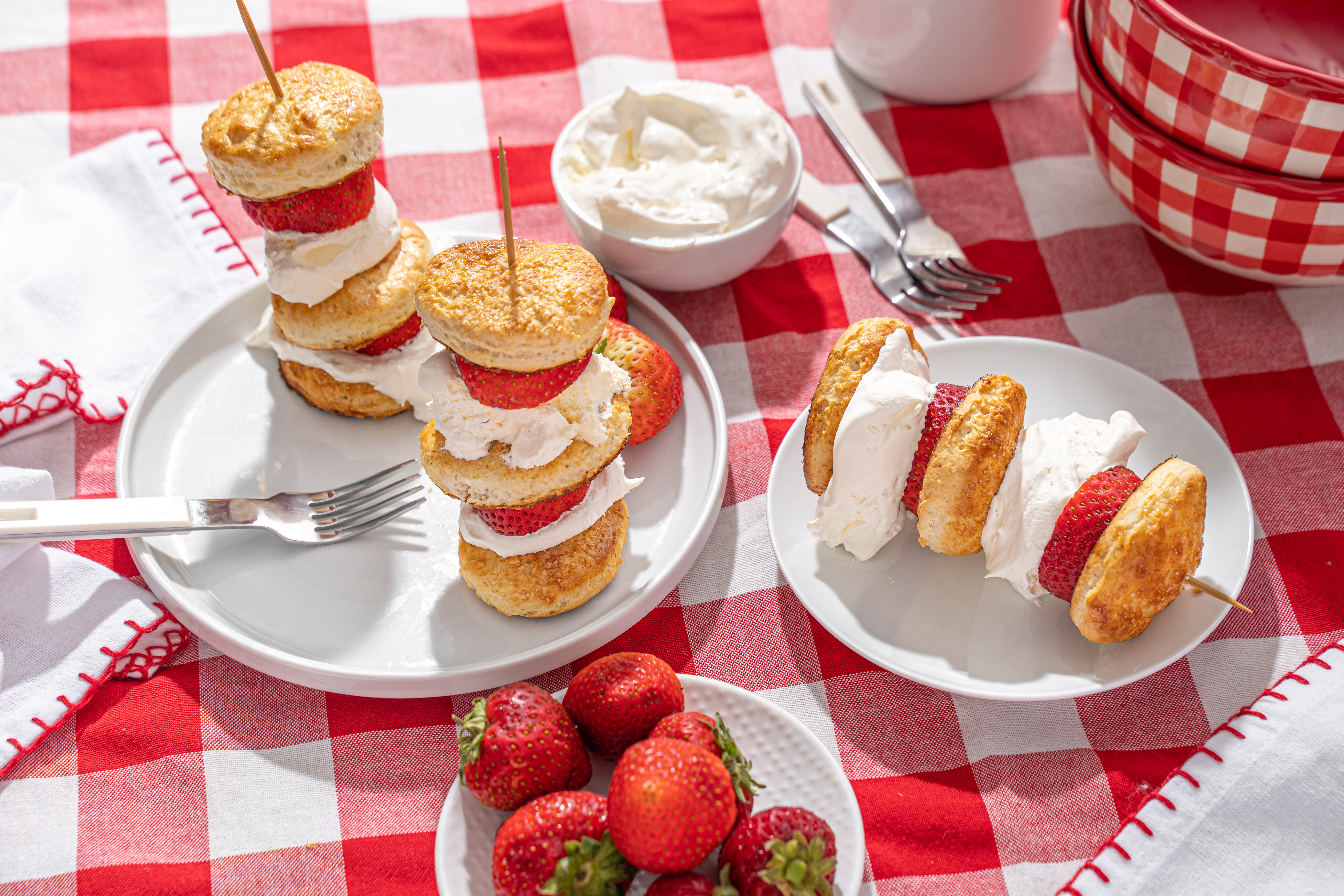 This dessert is just fun, whether you're simply enjoying your day in the kitchen or bringing over a special treat to the neighborhood cookout. Shortcake Kabobs embrace the summer spirit both in substance and style; buttery, homemade biscuits, creamy whipped topping, and bright, fresh strawberries combine for that wonderful seasonal treat, strawberry shortcake! But now, it's on a kabob! You can eat each treat one-handed alongside your barbeque kabobs! Isn't that just so flashy? Yes, Shortcake Kabobs will really turn some heads and electrify some taste buds!