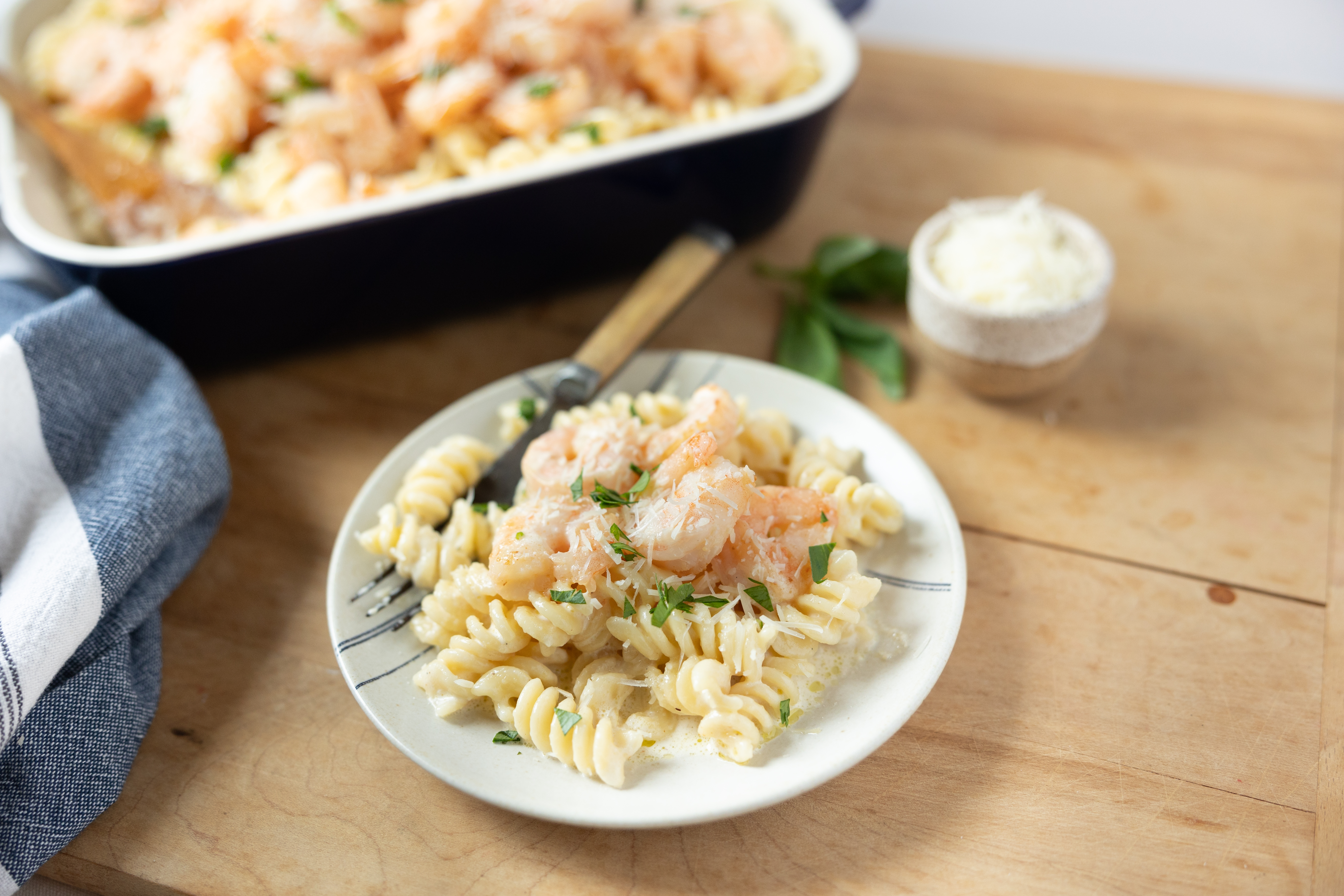 Step 8 -Cover the casserole dish with foil and bake until the pasta is al dente and the shrimp reaches an internal temperature of 145 degrees F, about 25 minutes.