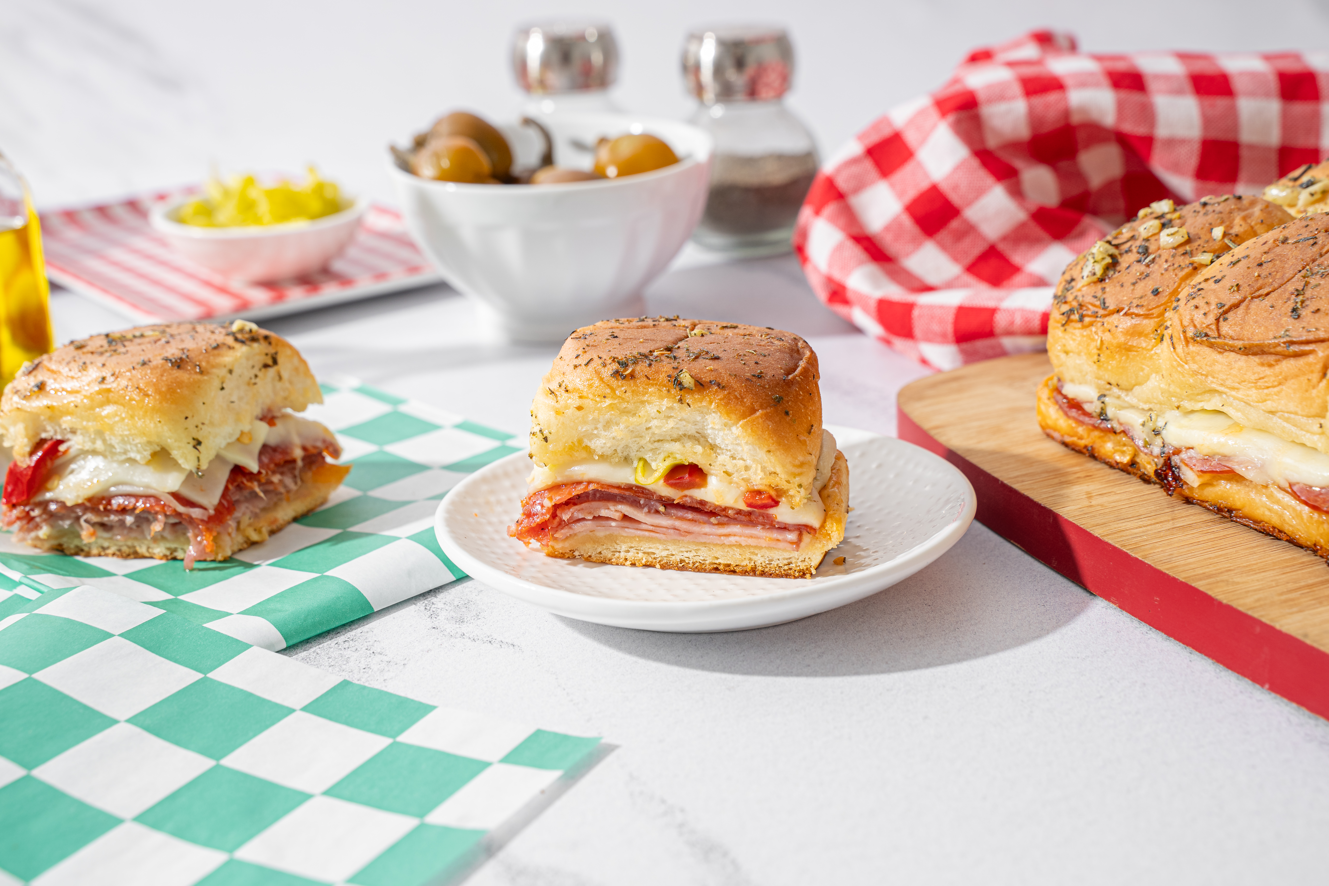 It's game time! These Slam Dunk Sliders are the star of the appetizer court! Layered with thin slices of ham, salami, and pepperoni, along with creamy provolone cheese, pepperoncini, and hot cherry peppers to add some spice, there really is no competition for this one! All stacked on an Italian-seasoned Hawaiian sweet roll and warmed up until golden-brown, you can count on these to be a game winning bite! Get in the game with Slam Dunk Sliders and your team will applaud your awesome efforts. Let's do this!