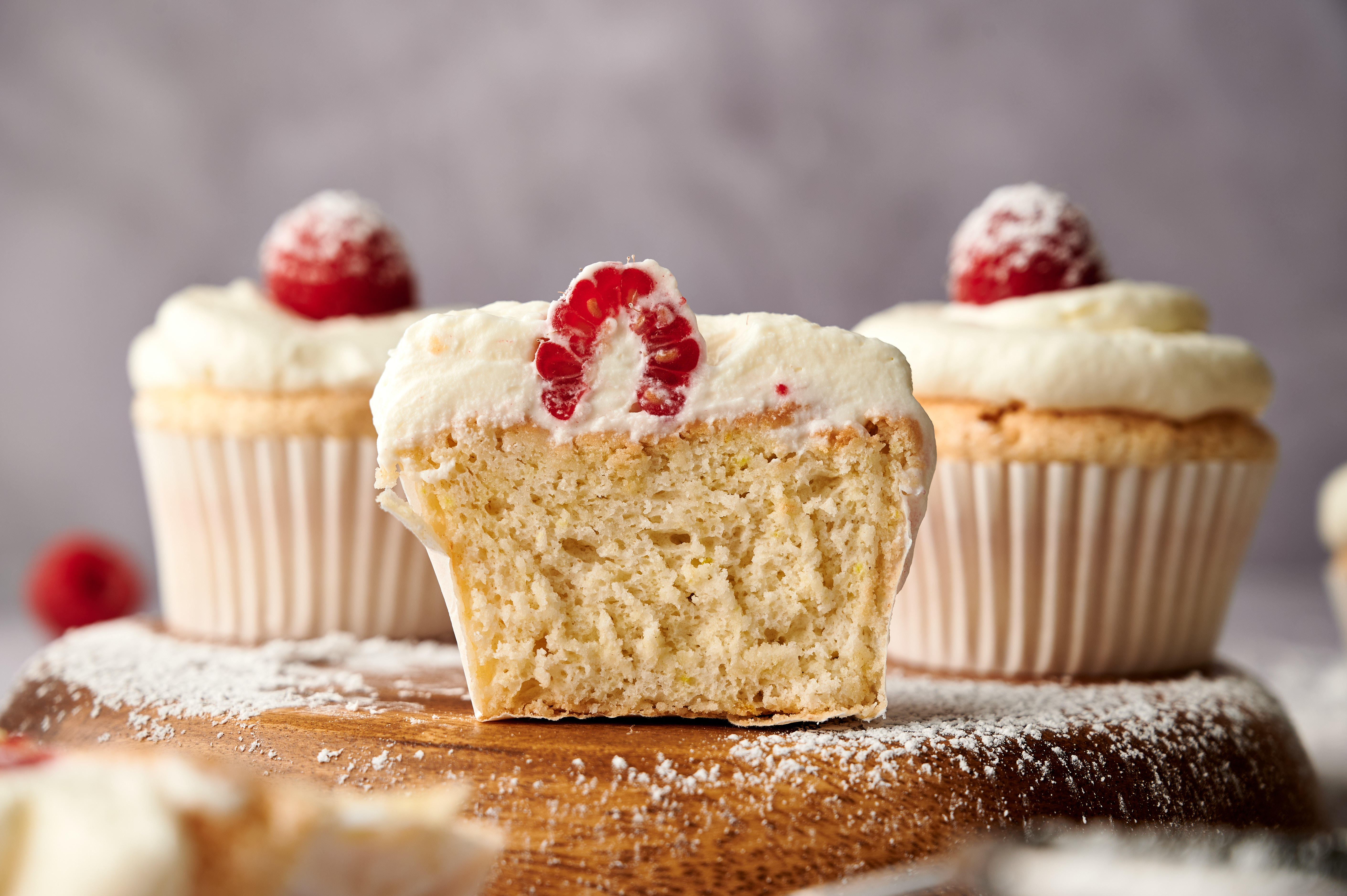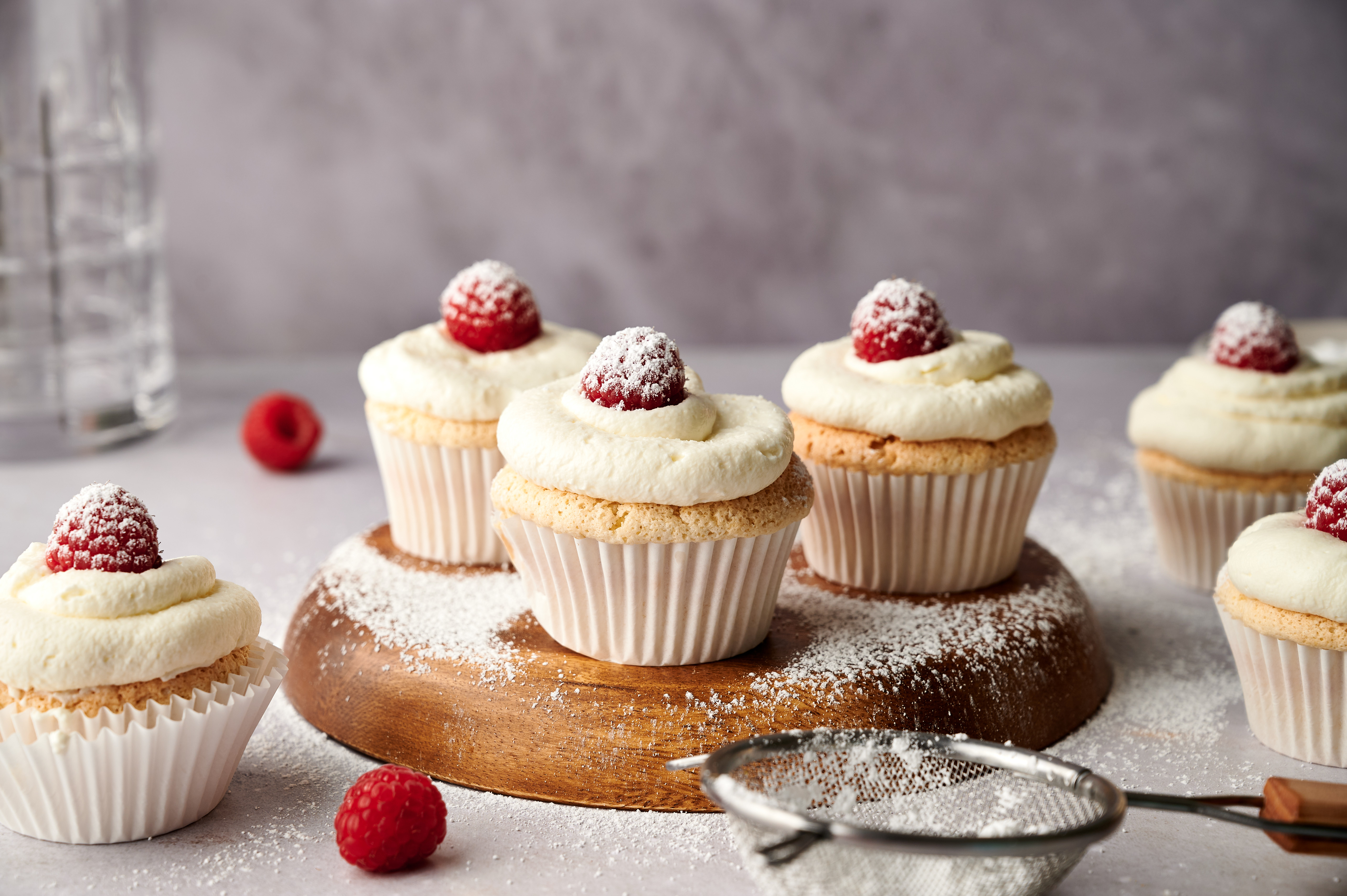 Step 14 -On the top of each of the cupcakes, add a dollop of the whipped cream and a fresh raspberry, then sprinkle with the confectioners' sugar.