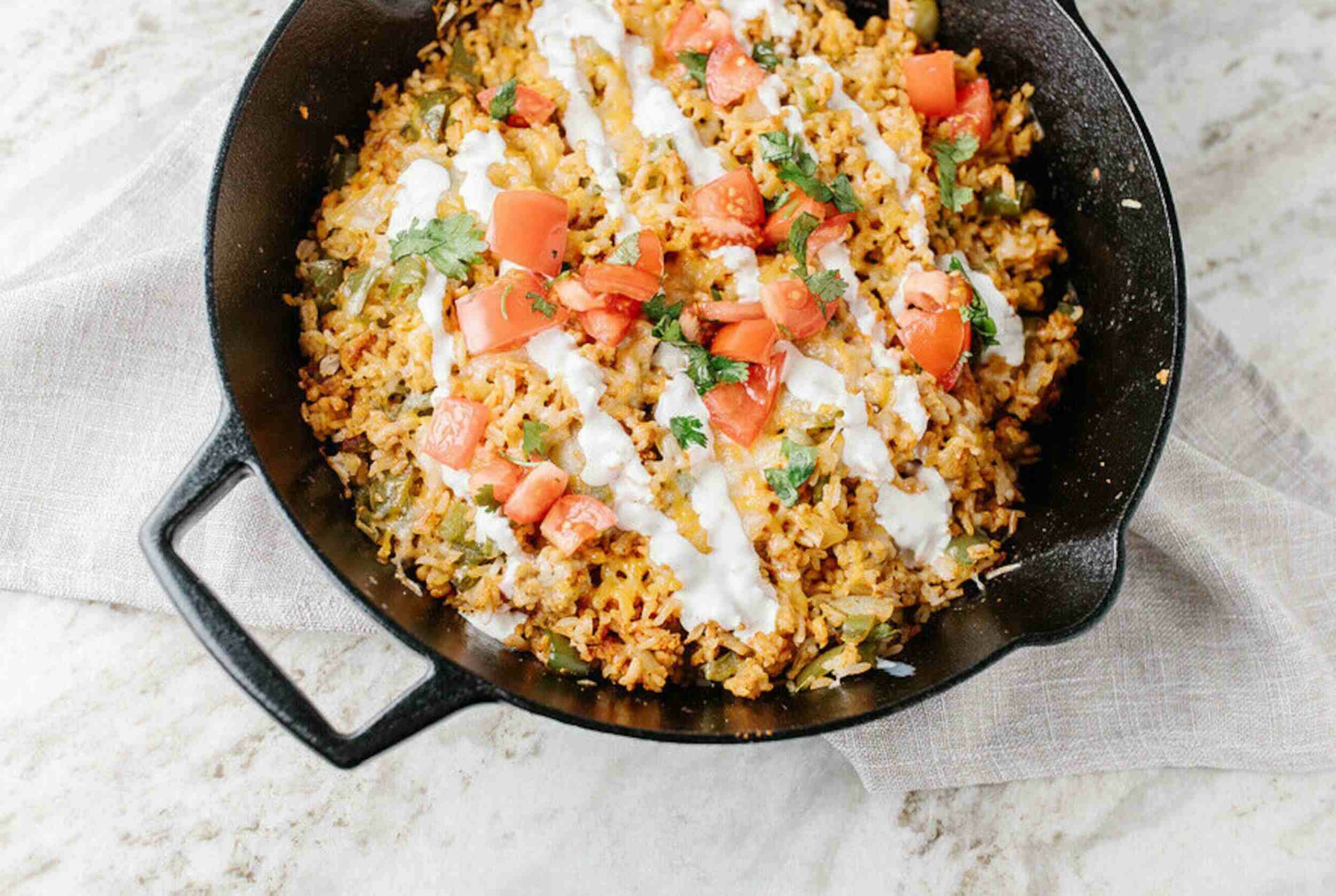 Step 17 -Top the skillet with the tomato and cilantro mix, followed by the creamy lime sauce on top.