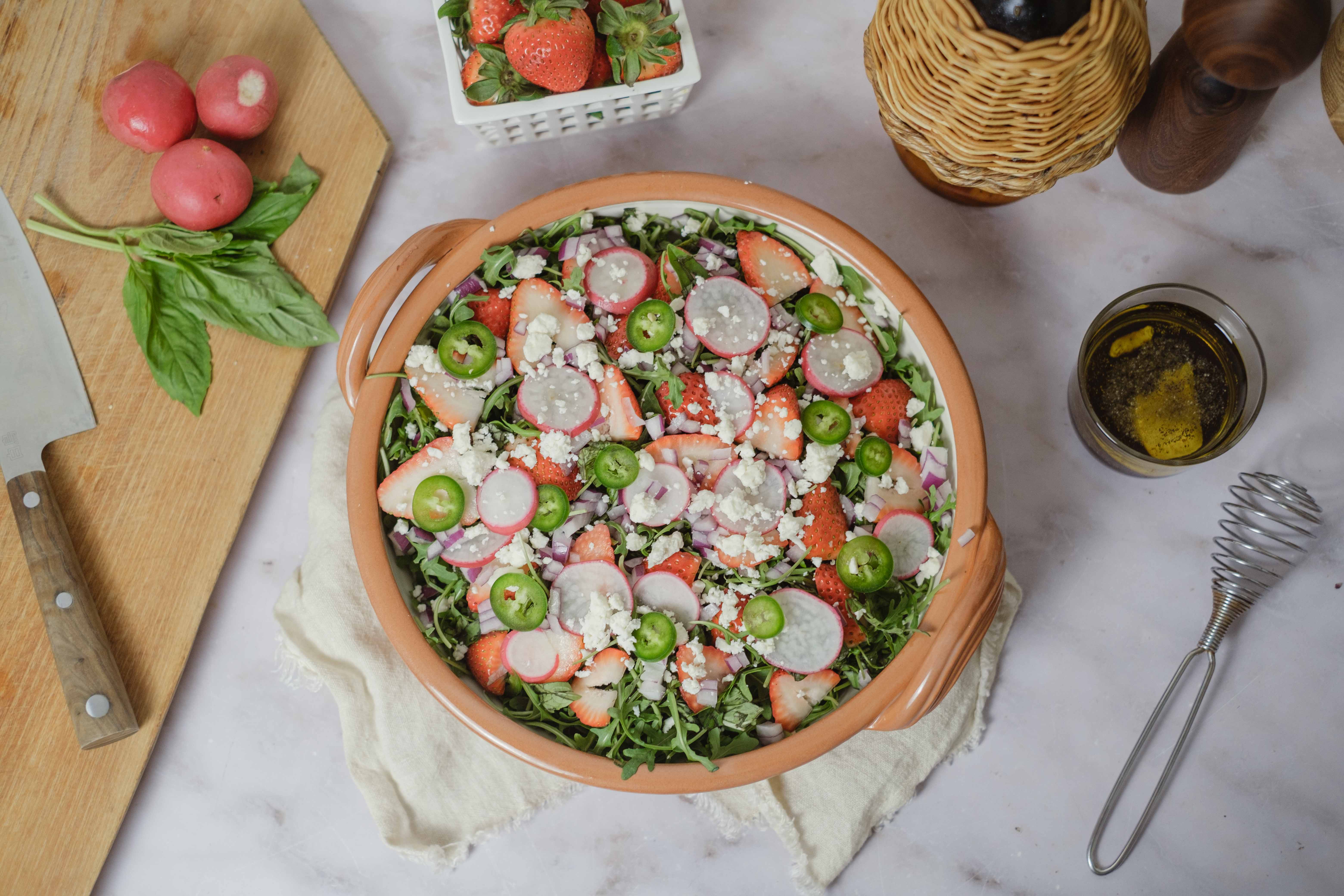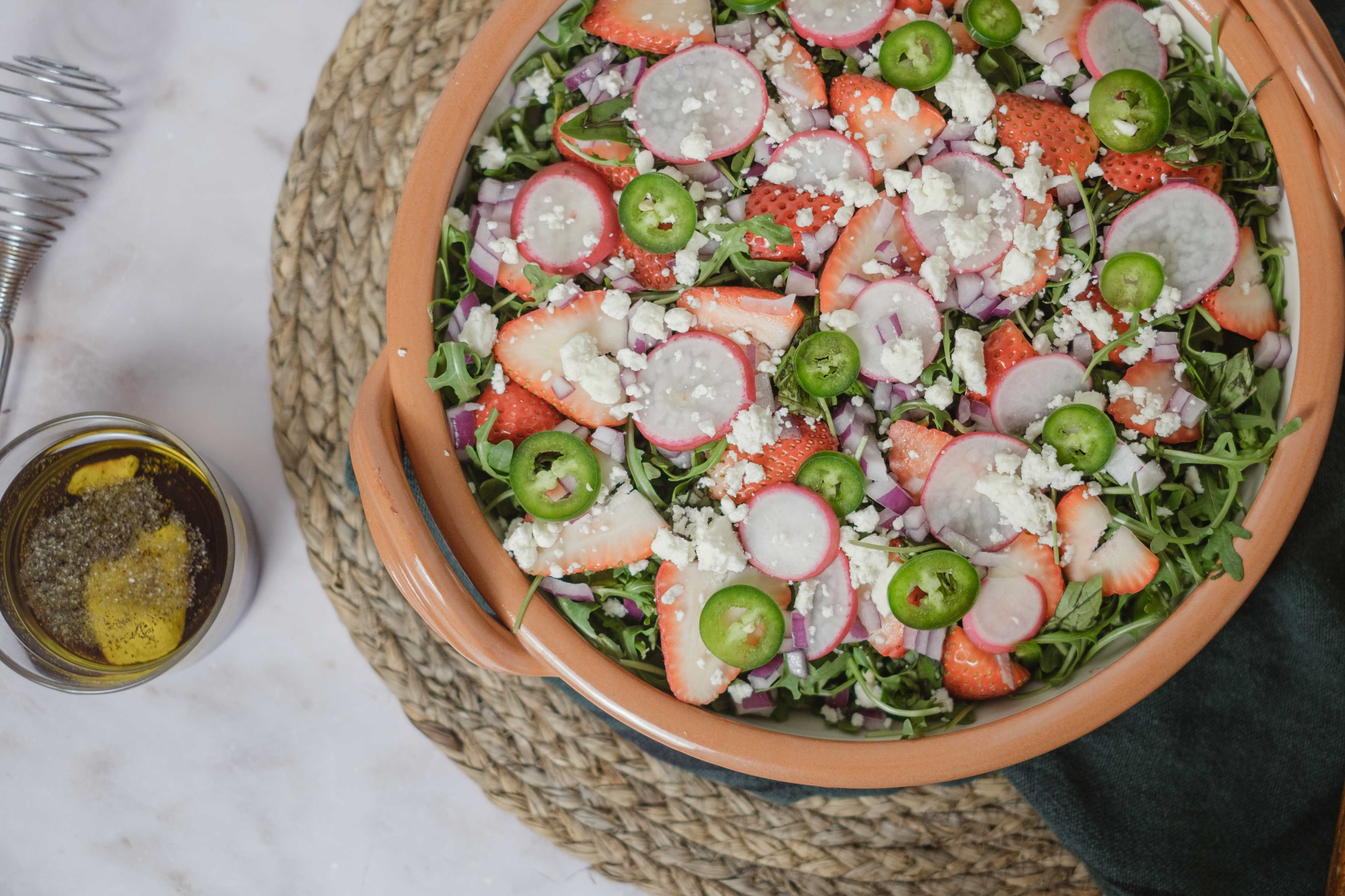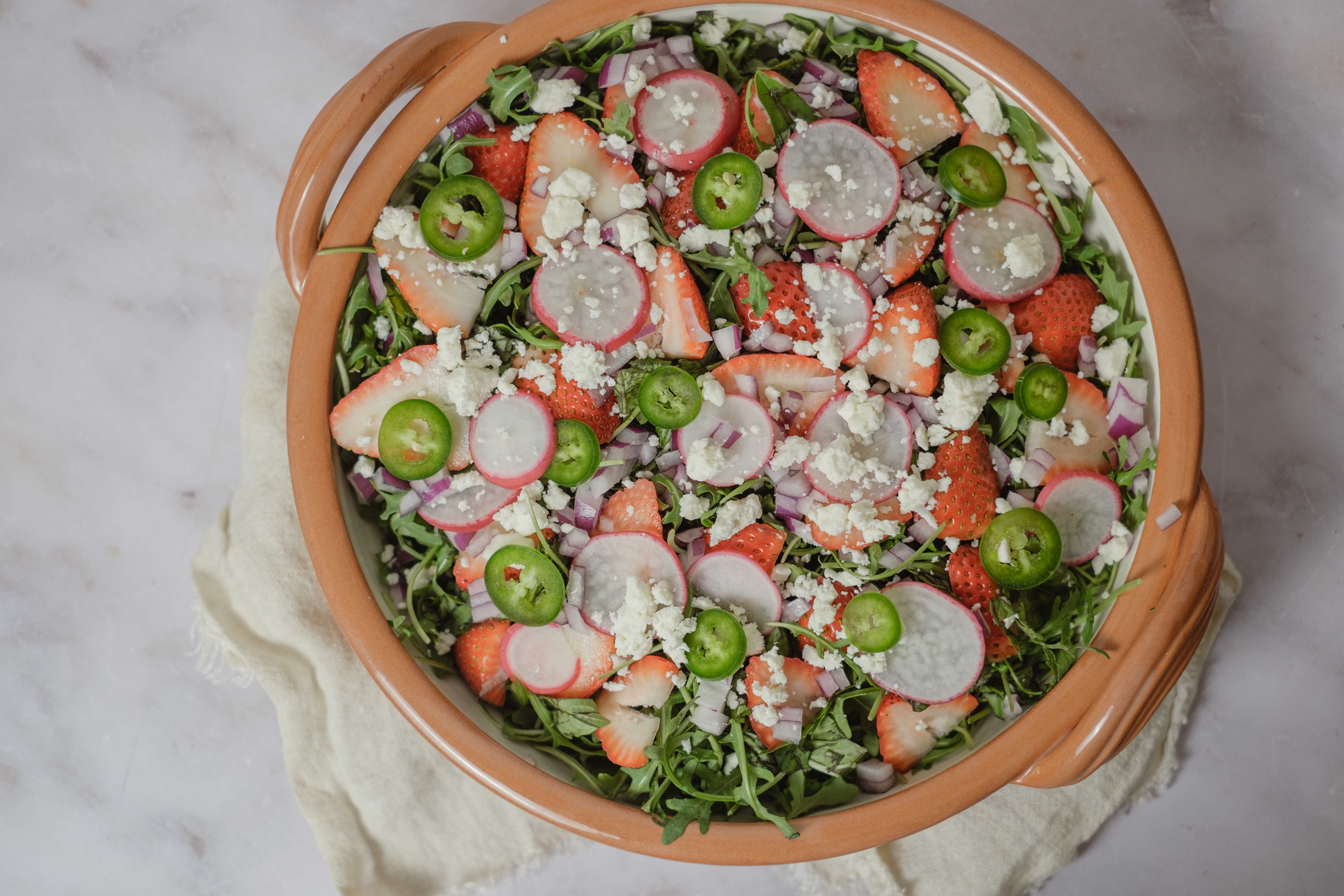 Step 3 -On a large serving platter or in a large bowl, layer the arugula, the basil, the strawberries, the red onions, the radishes, the jalapeños, the goat cheese, and the sunflower seeds.