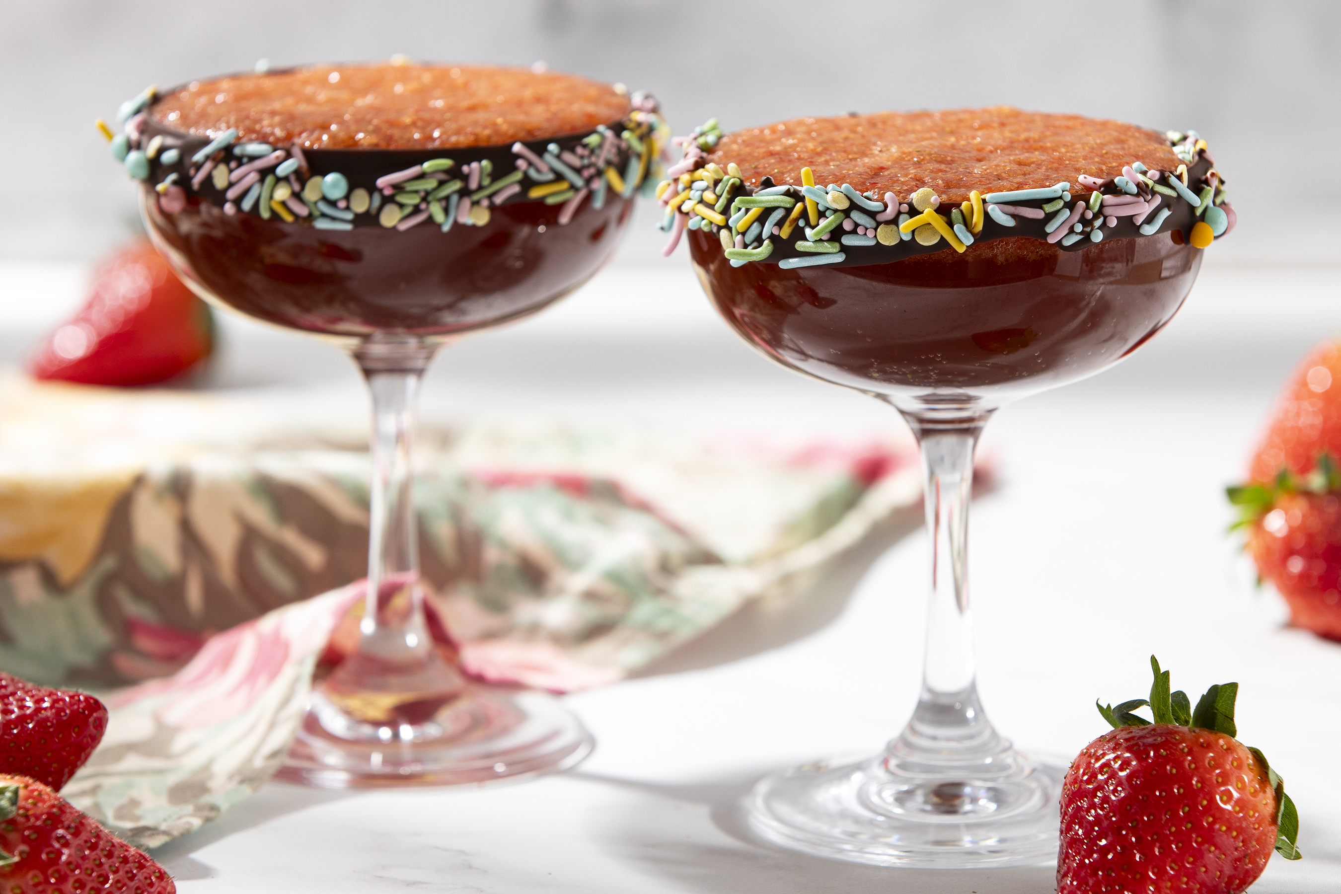 Chocolate-covered strawberries are one of life's greatest joys. The juiciness of the berries coated with the rich, smoothness of chocolate creates the perfect combo. Well, imagine those delightful flavors in liquid-form, poured into a glass with a rim coated in melted chocolate and sprinkles... we call that Strawberry Champagne Delight! Perfect for celebrating anything and everything, this syrupy glass of bubbly really brings the party. Cheers to Strawberry Champagne Delight — find something worth celebrating!
