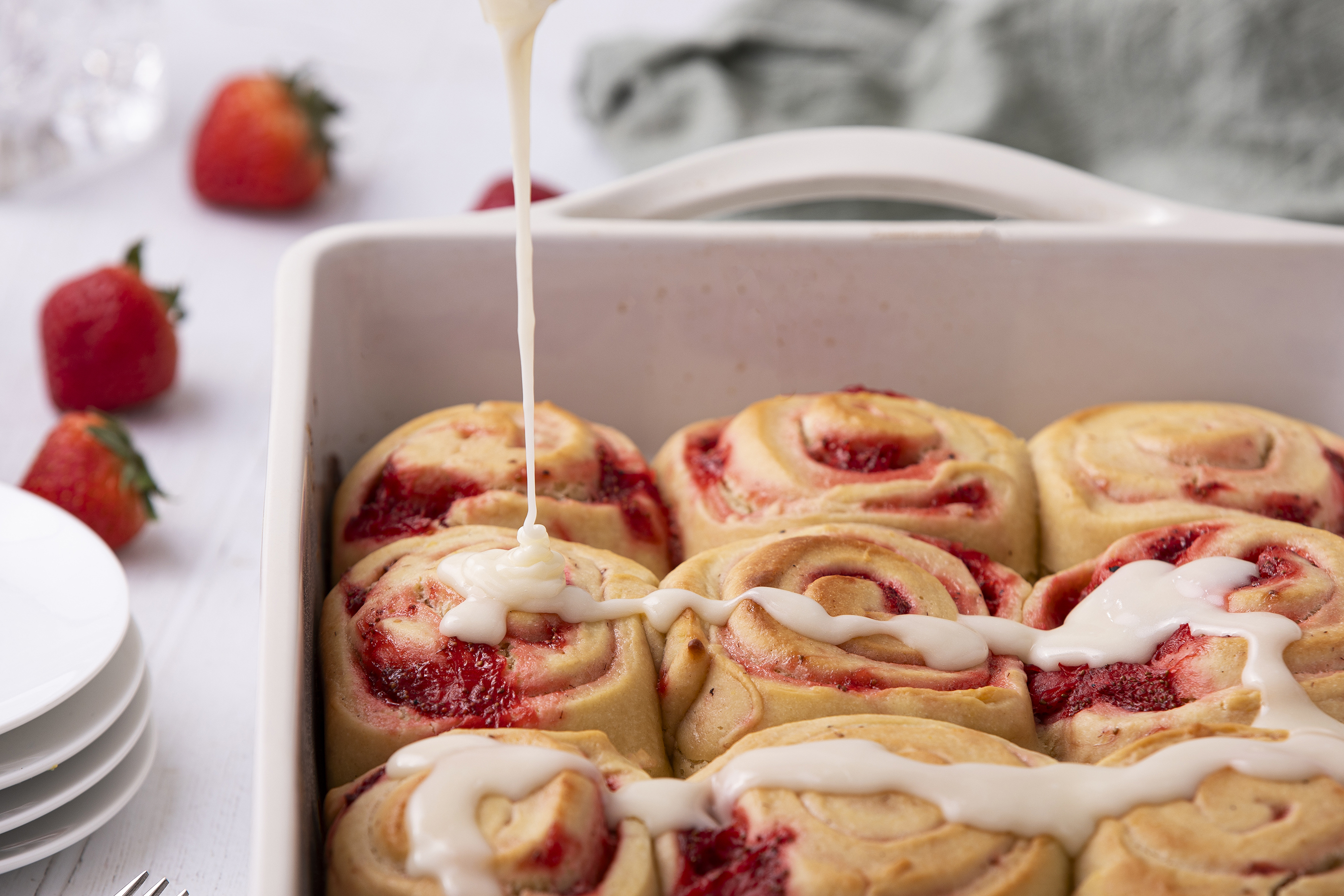 When it's that sweet, fruity season again, you know you just have to have them. Strawberry Sweet Buns will be calling you from the patch the moment those rosy berries are ripe! A fluffy yeast bun is entwined with a fresh strawberry filling, sprinkled with finely chopped pistachios, and topped with an amazing glaze. After one bite, you know that summer is here! Surprise your family with Strawberry Sweet Buns for an extra sweet, summery treat! They're such a perfect way to start the day!