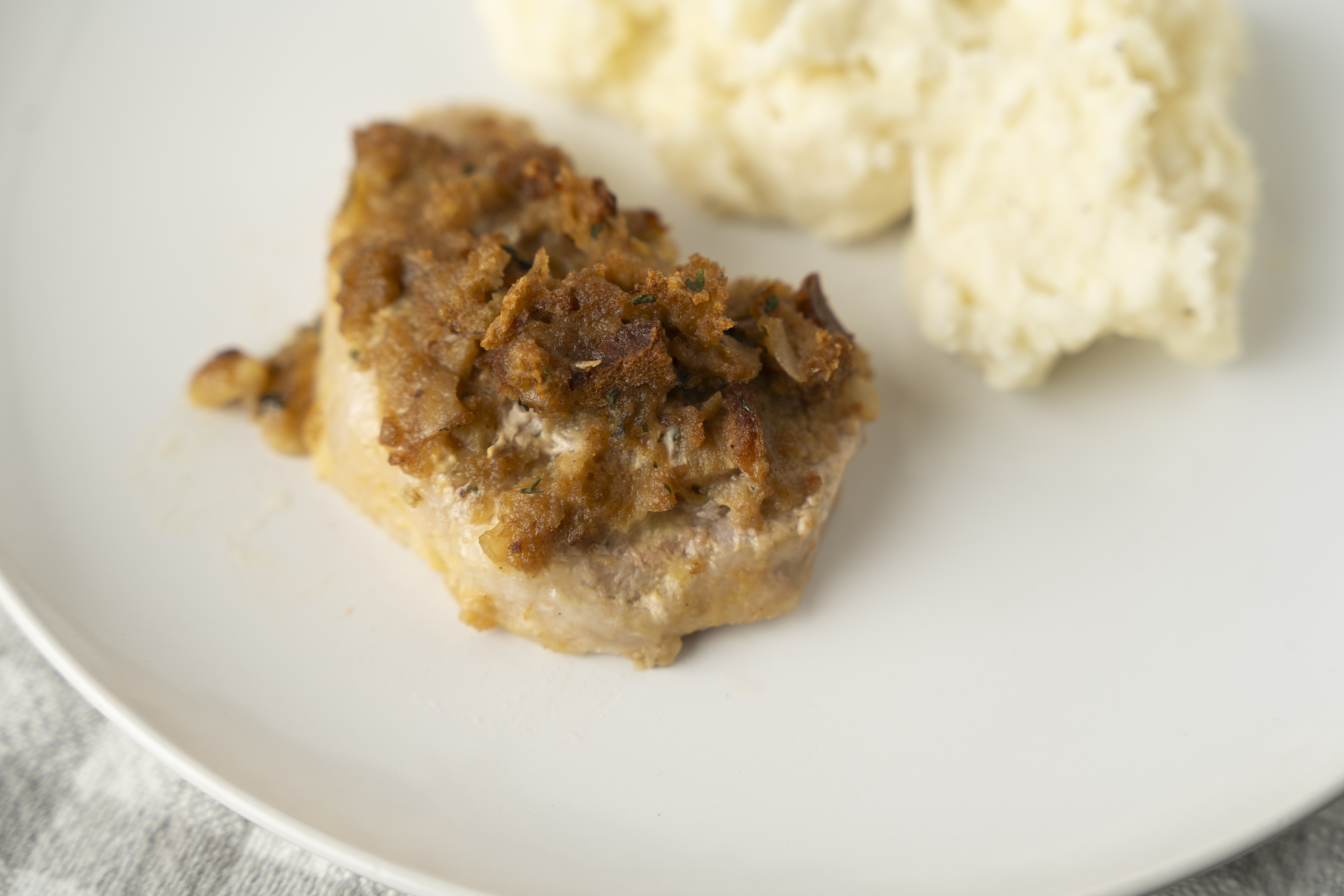 Stuffed Pork Chop Bake aren't stuffed chops in the traditional sense. Each slab of pork is actually piled high with a crisp yet tender, savory stuffing. What a perfect pairing for sweet and succulent chops! Oh, and the mushroom sauce is so simple and so delicious! Well, Stuffed Pork Chop Bake may not be traditional but it sure is tasty!