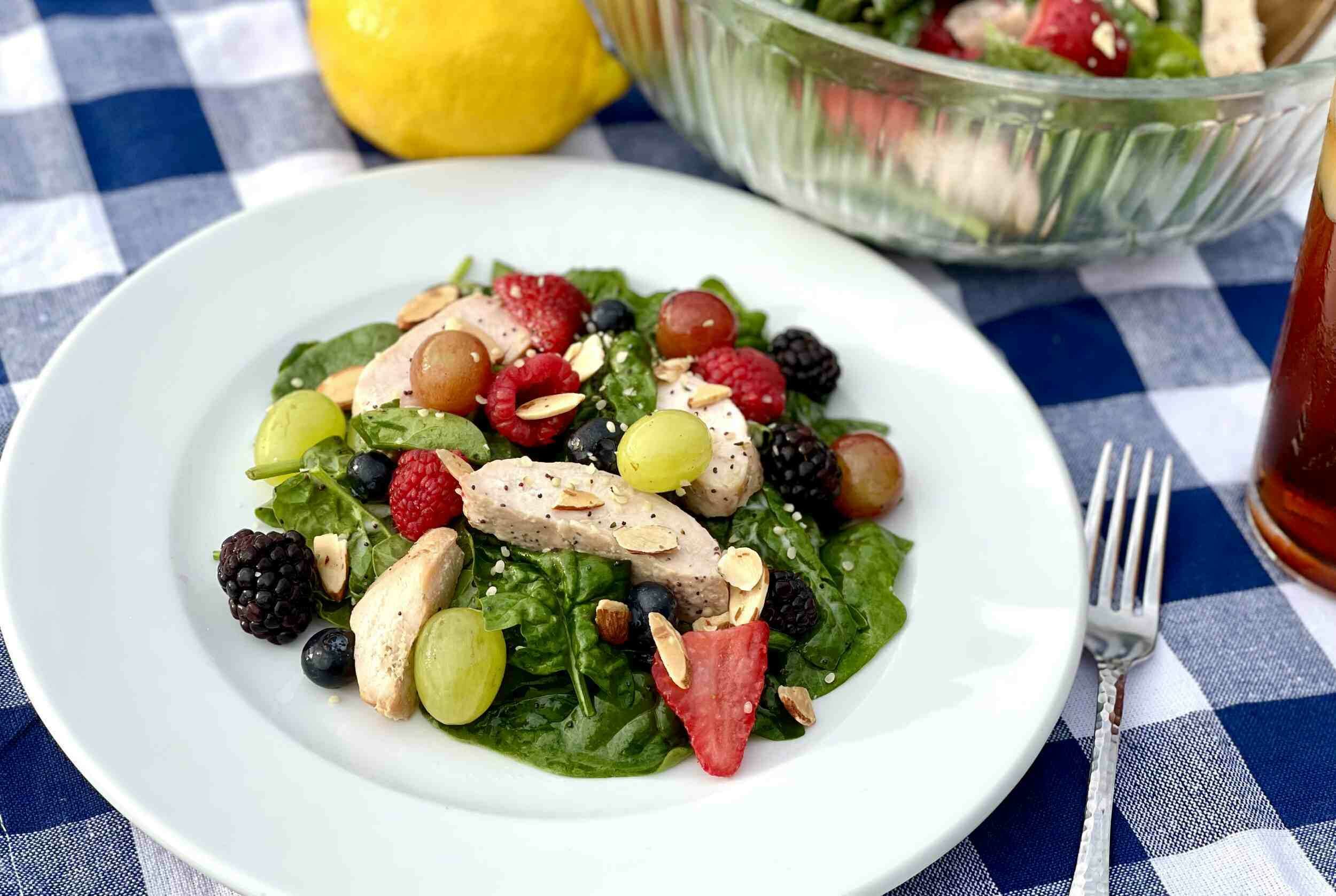 If you’re looking for an easy yet delicious summer lunch, your search is over! This Summer Chicken Salad with Poppyseed Dressing is nourishing and filling, yet light enough for you to crave it on the hottest days of the year. This salad is full of tender chicken, fresh spinach, juicy berries, sweet grapes, and more; it’s certainly not like any chicken salad you’ve tried before! It’s topped with a scrumptious homemade citrus poppyseed dressing for the perfect finishing touch. Summer Chicken Salad with Poppyseed Dressing is just what you need to satisfy your hunger during the summer months!