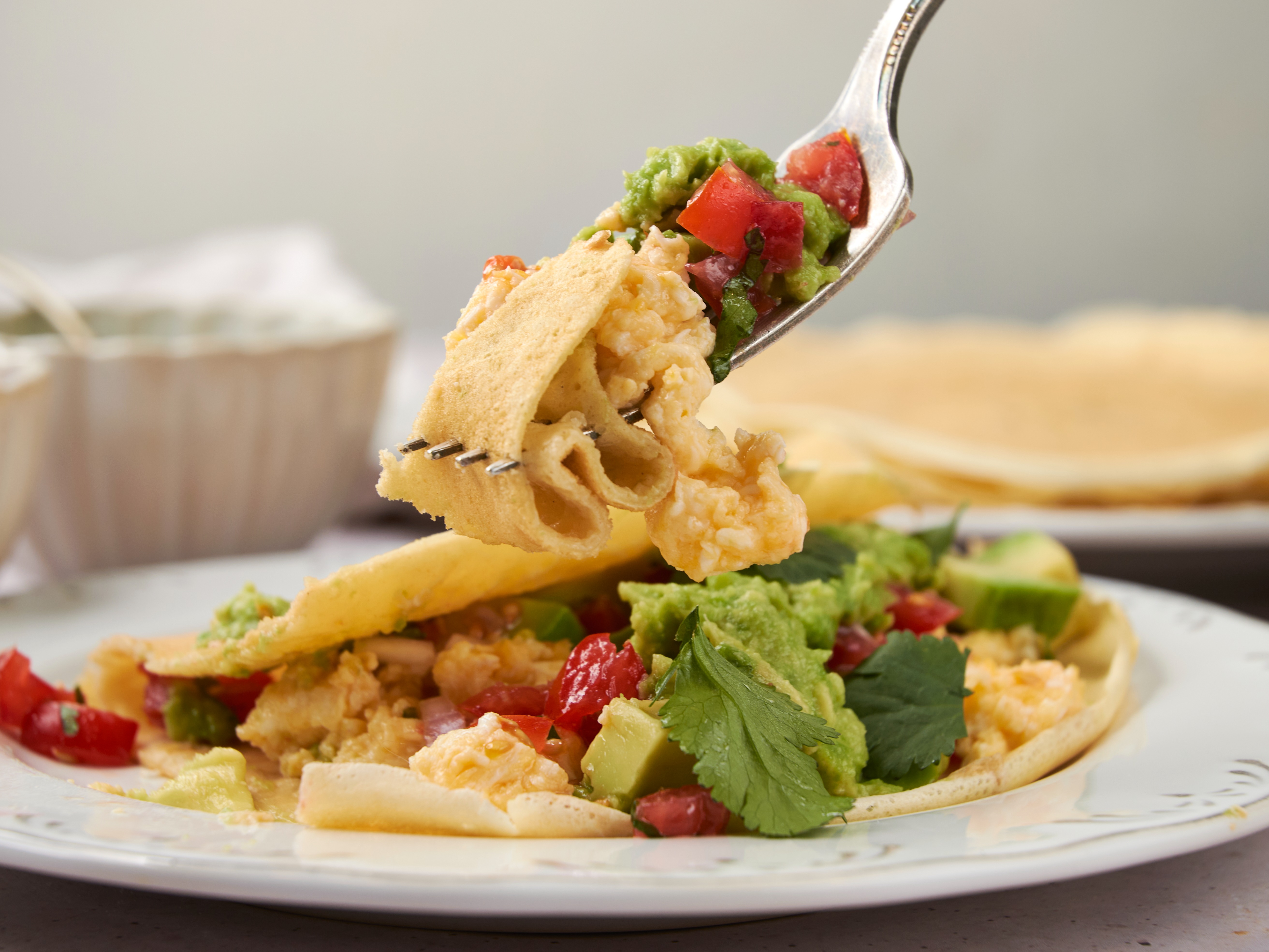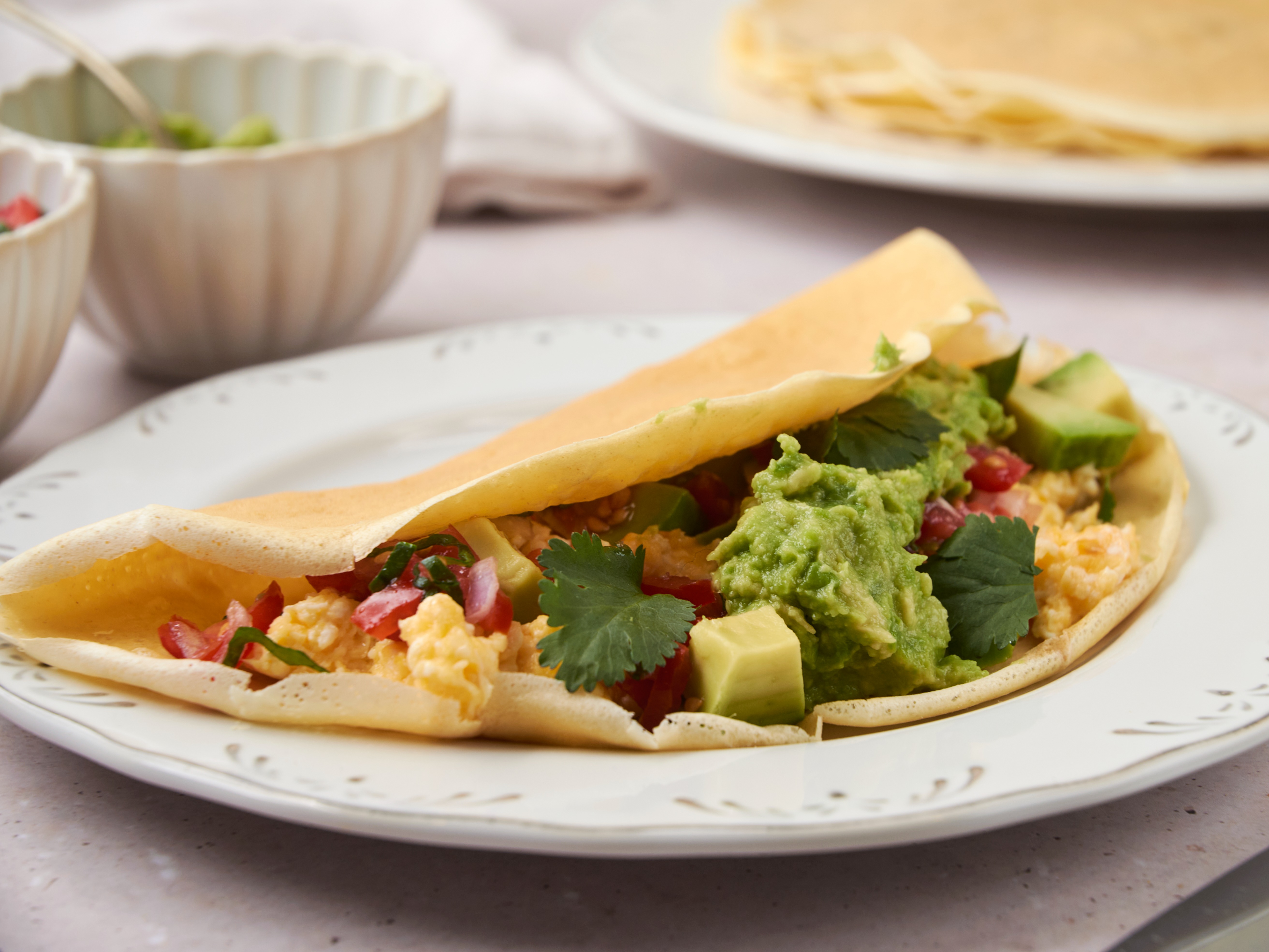 Step 11 -Evenly add the egg mixture over half of each of the pancakes, then evenly top with the pico de gallo and the avocado. Fold the wraps in half.