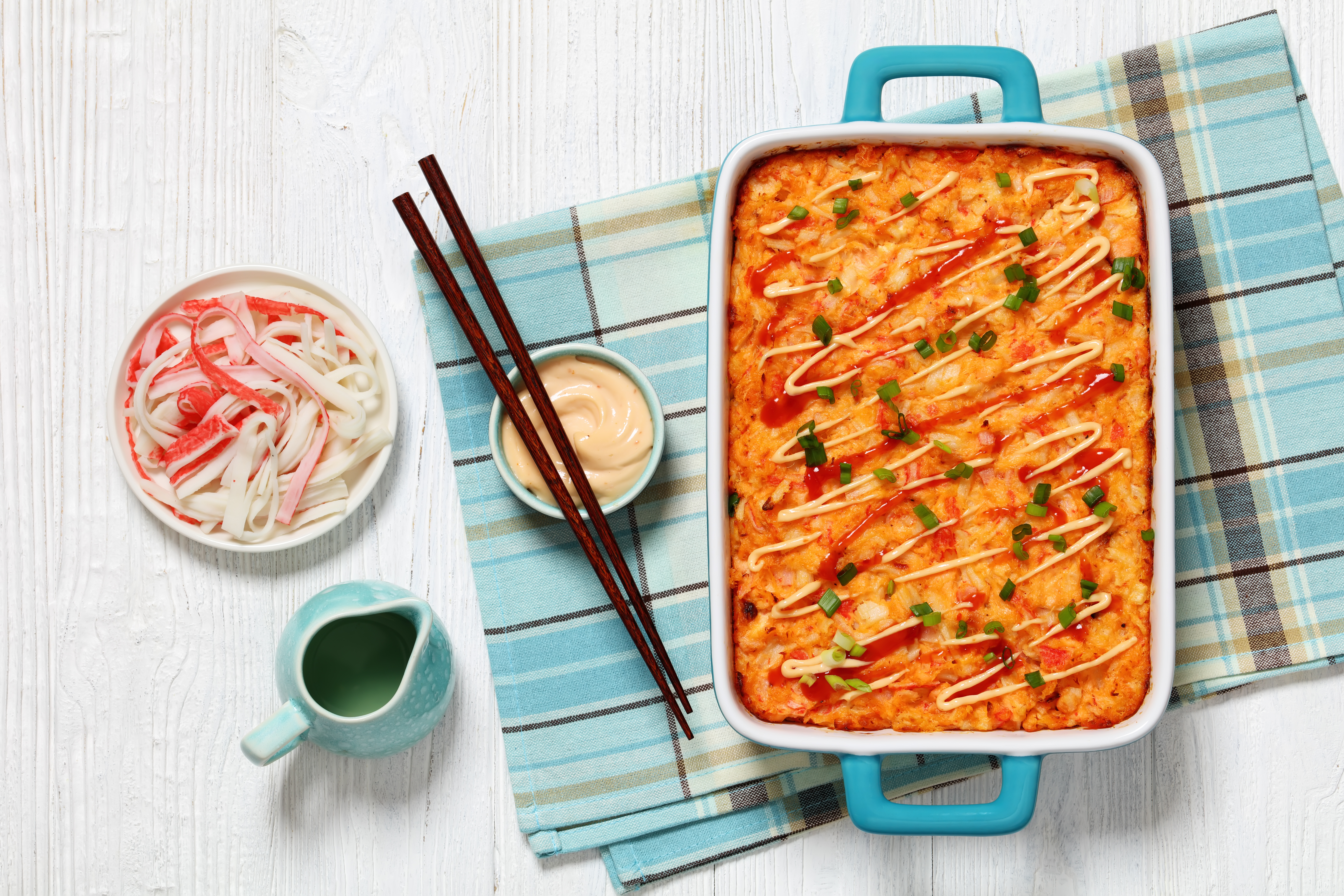 Oooh sushi in casserole form! That's a new twist on both Japanese and American cooking, for sure! Sushi Bake features a layer of rice holding up a bed of succulent salmon and some beloved sweet, savory crab in a mix of tangy and smooth Japanese mayo and spicy sriracha! Served up with your favorite sushi toppings, Sushi Bake is how you get that fresh sushi experience without trying to expertly roll sushi yourself!