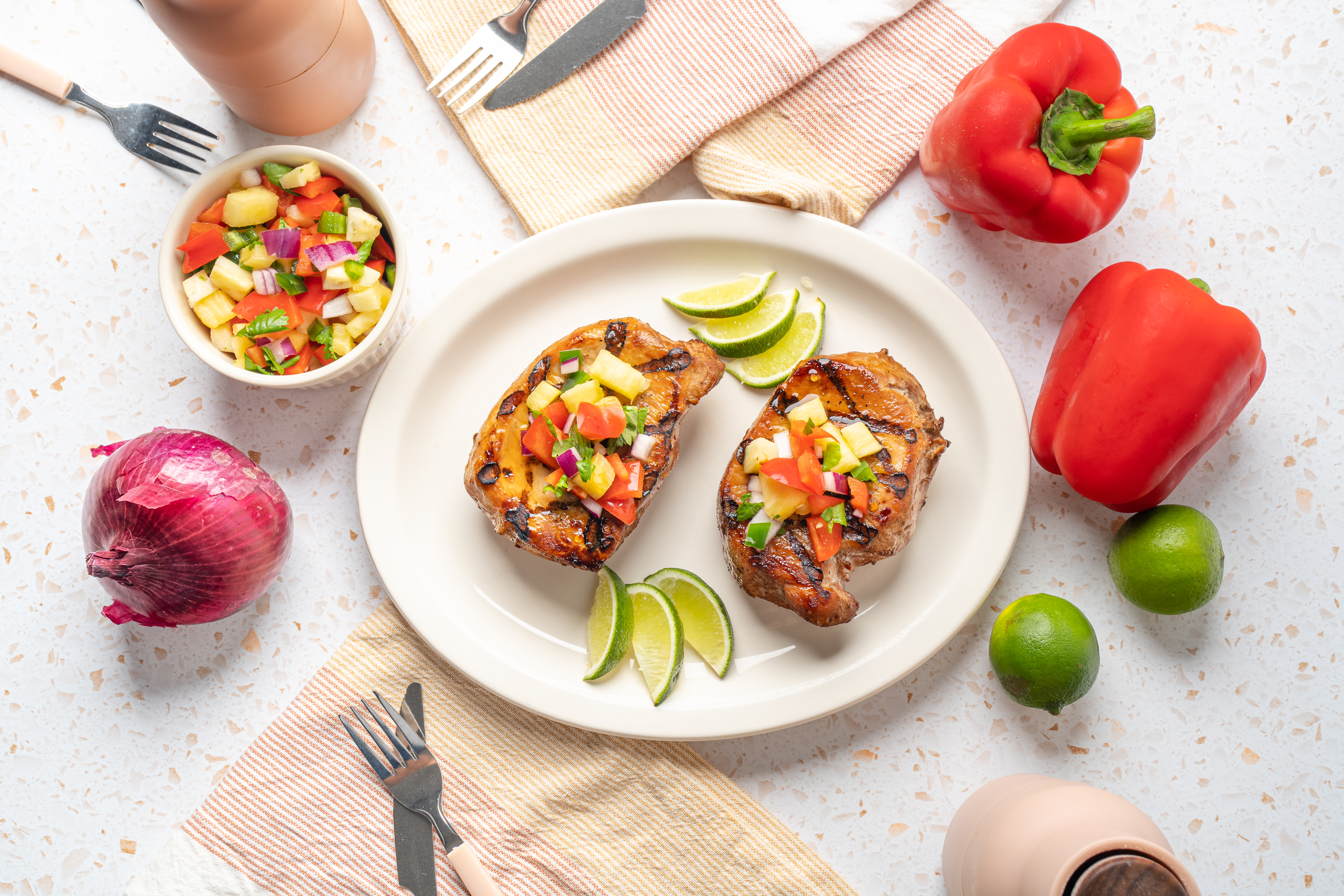 It's a sweet, sweet summer ahead with plenty of amazing grilled dishes to celebrate! Sweet Summertime Pork Chops is one such dish, and perhaps will be the most memorable! The pork is marinated in a spicy and savory concoction of sauces and seasonings, and then is grilled until tender and juicy, before being topped with a zesty, tangy, and sweet pineapple salsa! It's a firework display of flavors, and the perfect way to enjoy cookout season! These Sweet Summertime Pork Chops will sweeten up your memories of the summer!