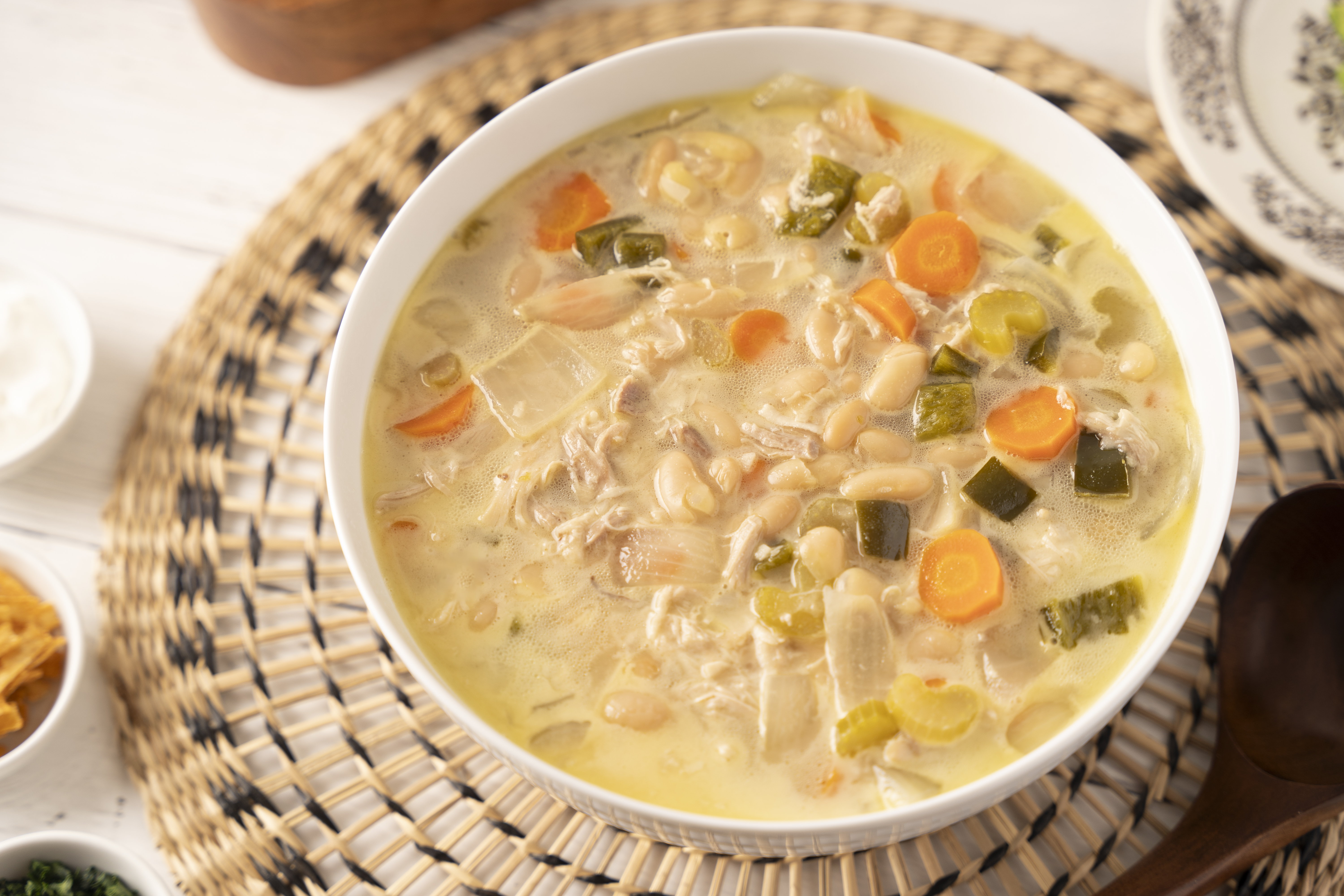 Step 1 -In a 6-7-quart slow cooker, add the chicken, the broth, the celery, the carrots, the poblano peppers, the onions, the garlic, the cumin, the coriander, the beans, and the salt.
