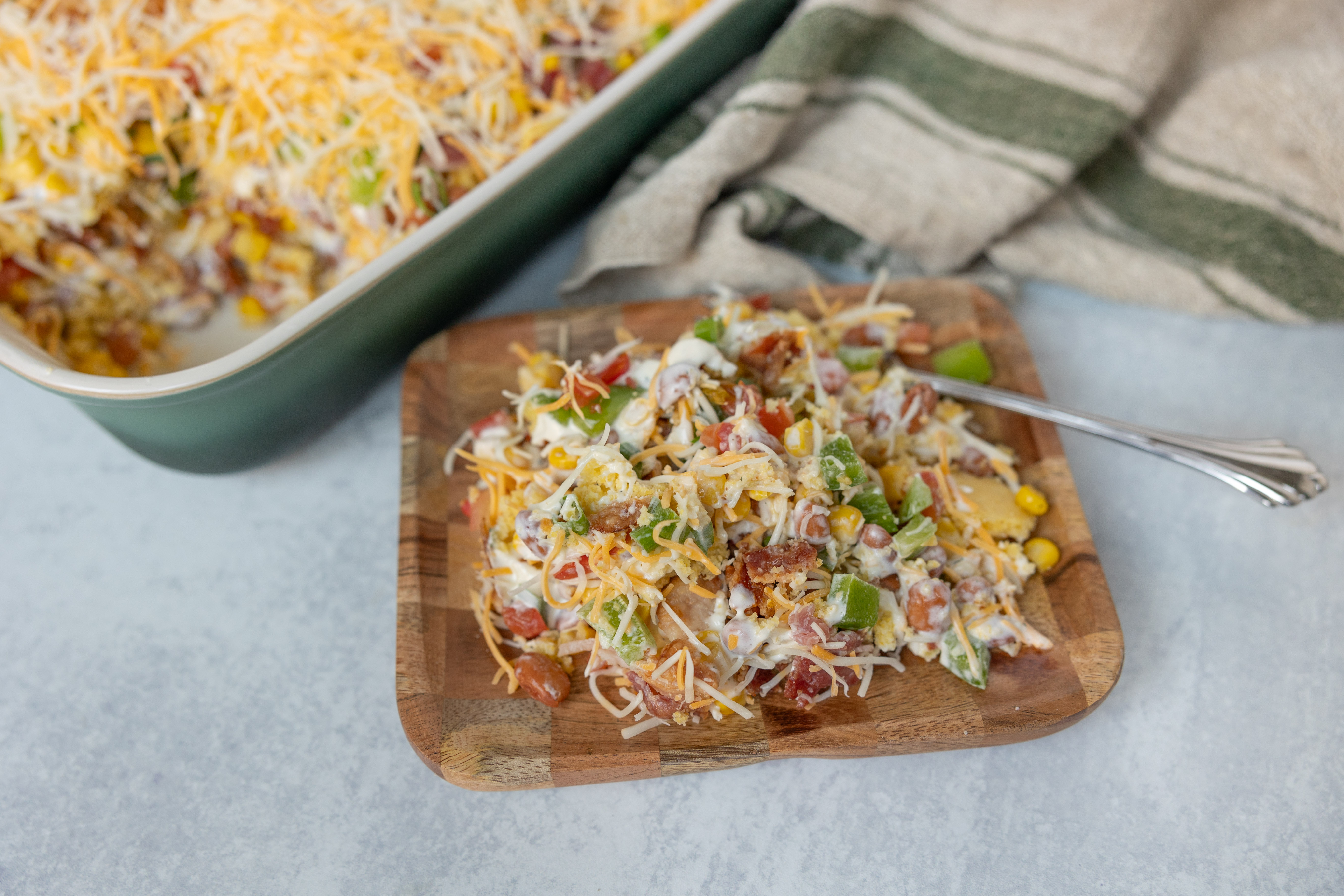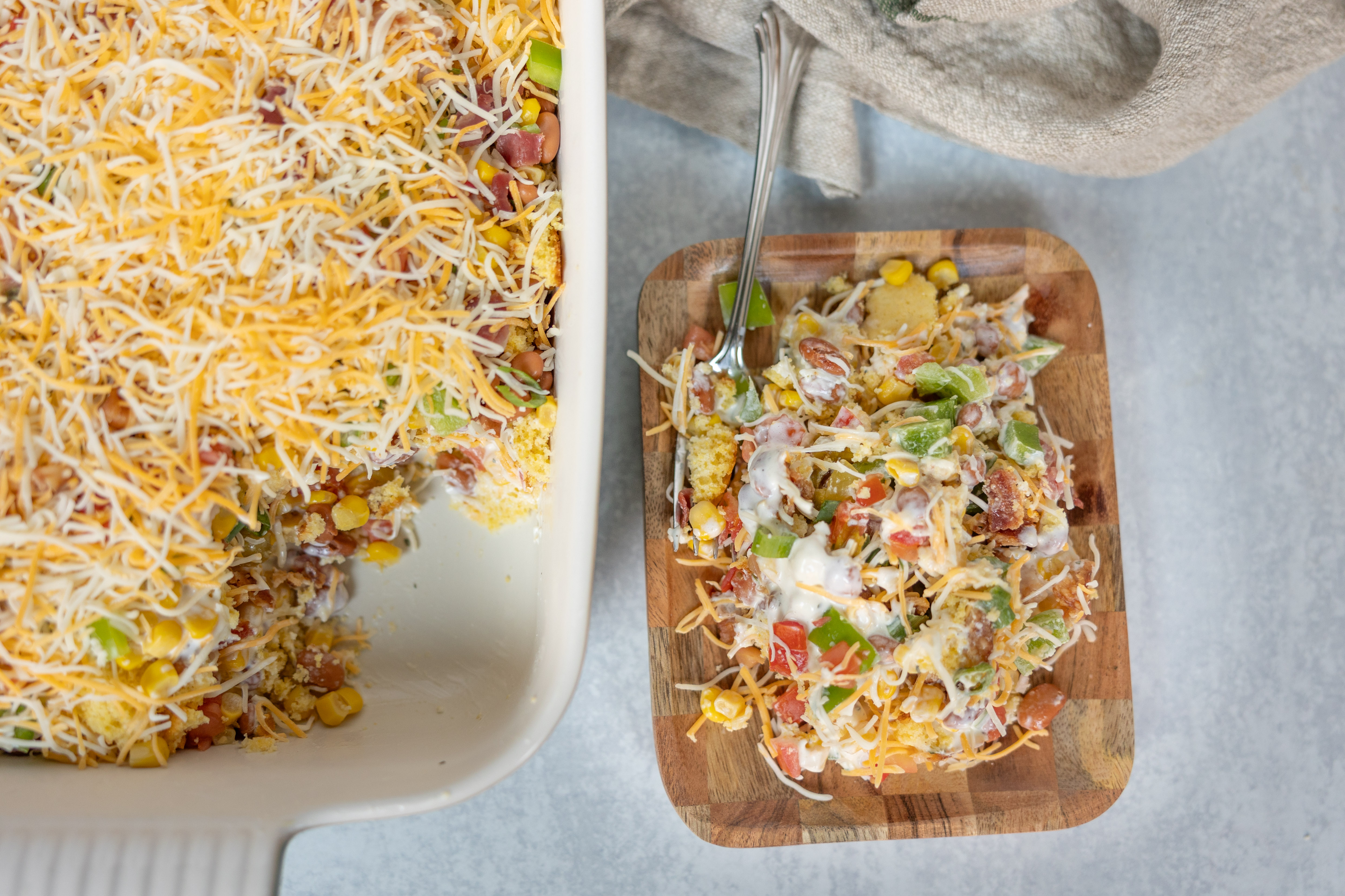 It's called "That Picnic Salad" for a few reasons! First, coming up with names is hard, and sometimes you just have to go with the easiest answer (and who wouldn't love a cornbread salad?!). Second, it really is ideal for picnics; it's filling and tasty, packed with layers of succulent bacon, hearty beans, summery corn, juicy tomatoes, creamy and tangy homemade ranch dressing, and a spicy chile cornbread crumble! And third, when people are asking for seconds (and they will) they'll be so delighted, they'll just default to asking for "more of That Picnic Salad please!" And that works for us!