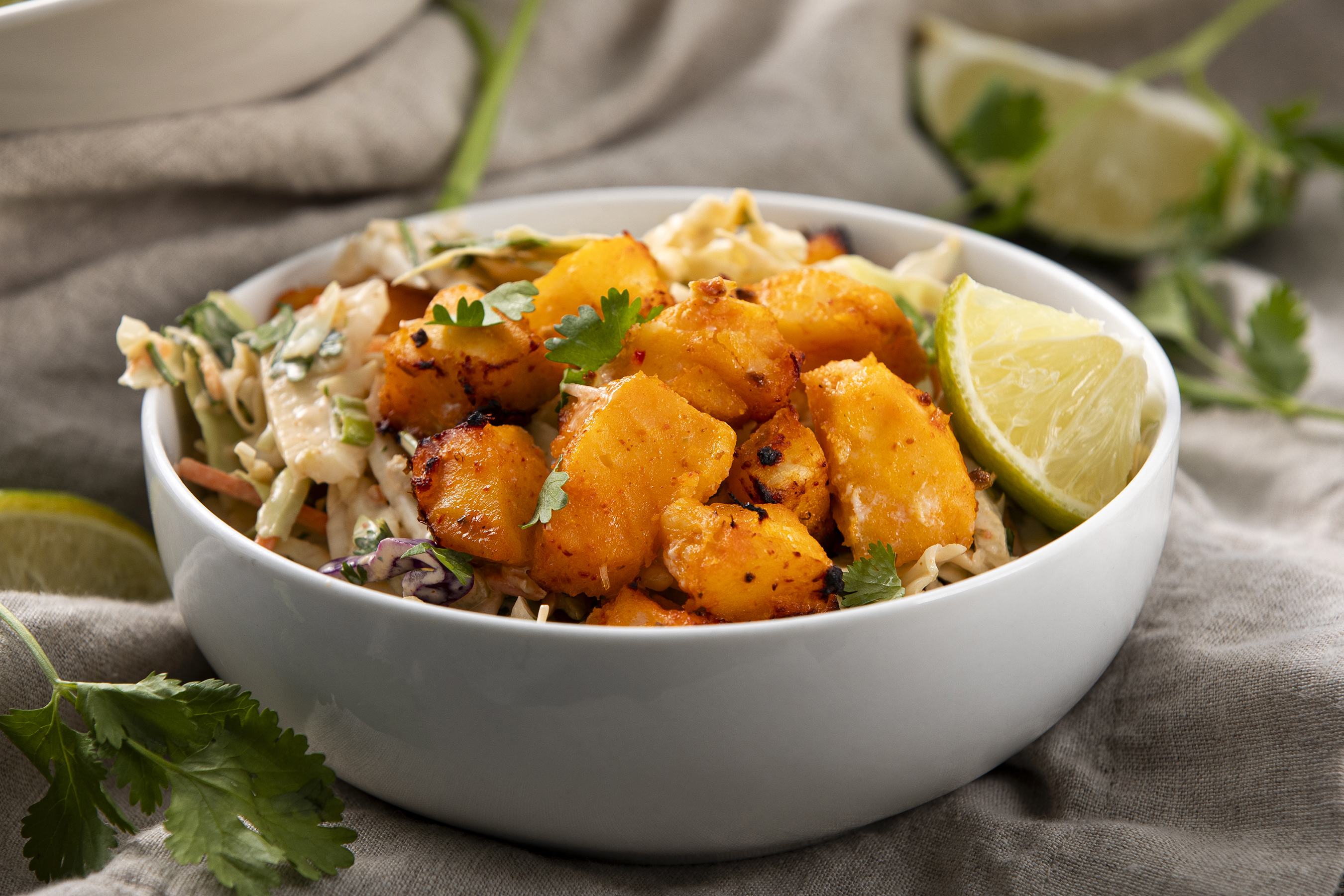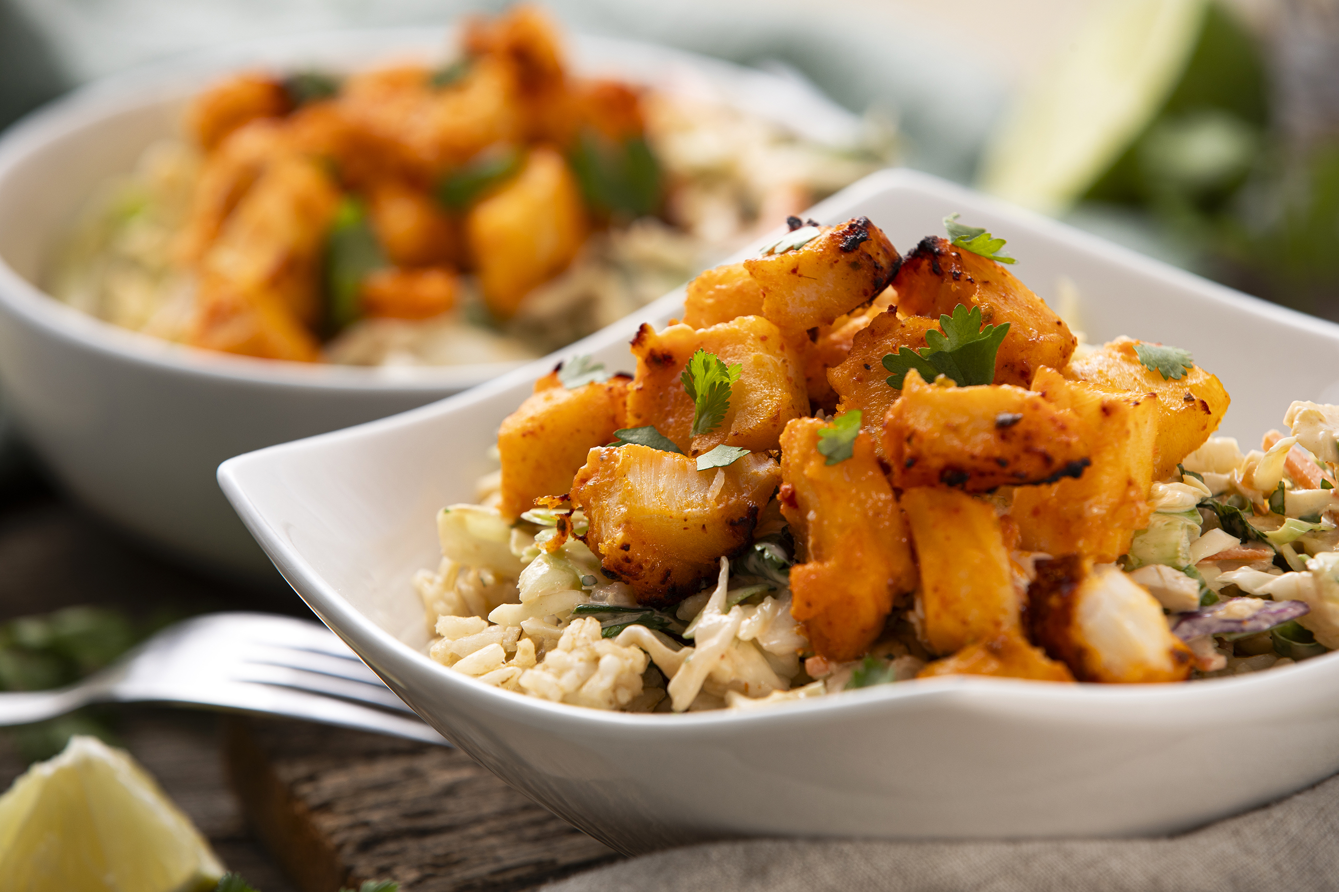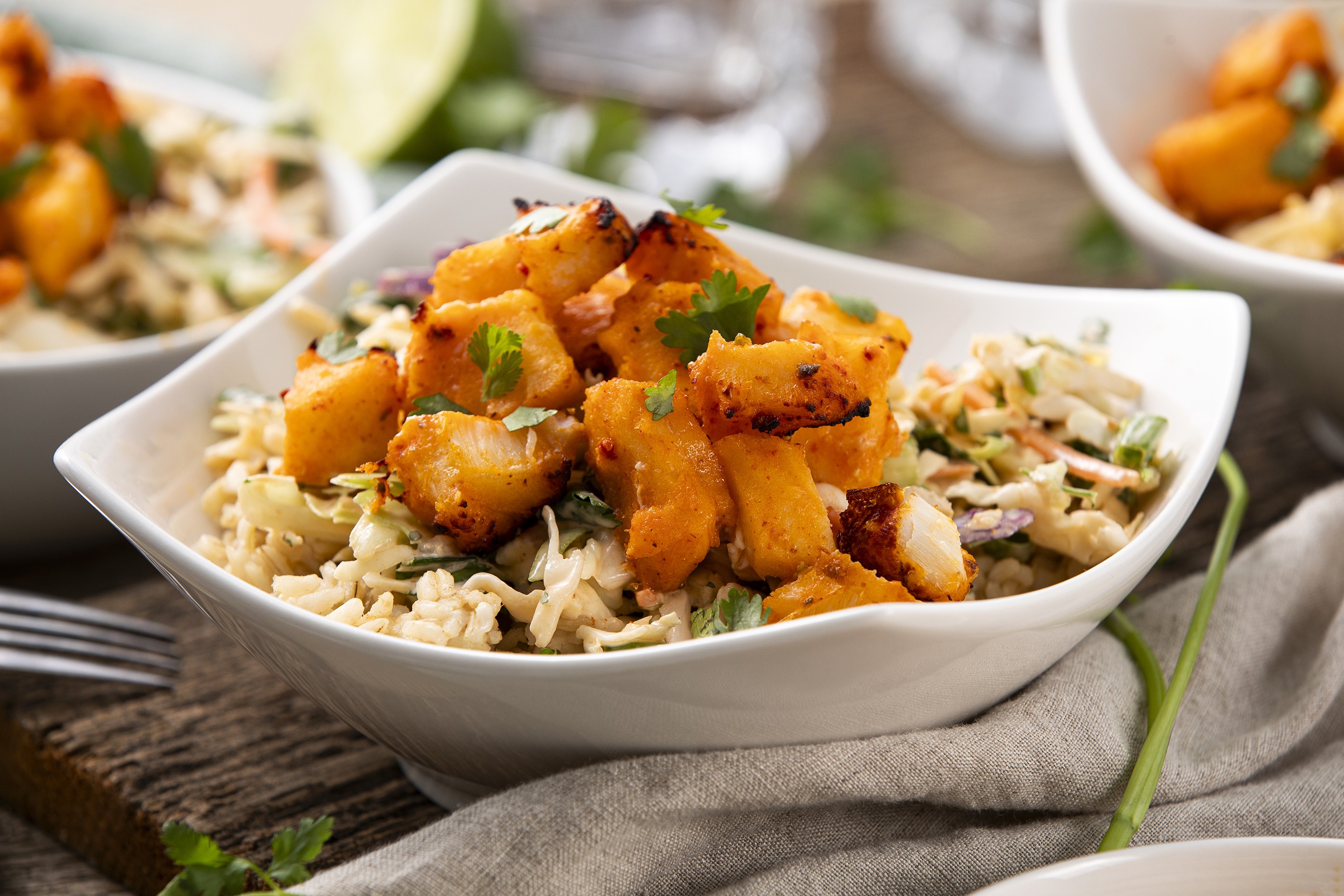 The Fish Bowl is an ocean of flavor! Sorry, we couldn't resist the wordplay, just like how you won't be able to resist the golden, flaky, savory fish with zesty seasoning! Served with nutty brown rice and creamy, crunchy coleslaw, The Fish Bowl really does "seas" the day, especially given how quick it is to make! "Sea" what we did there?