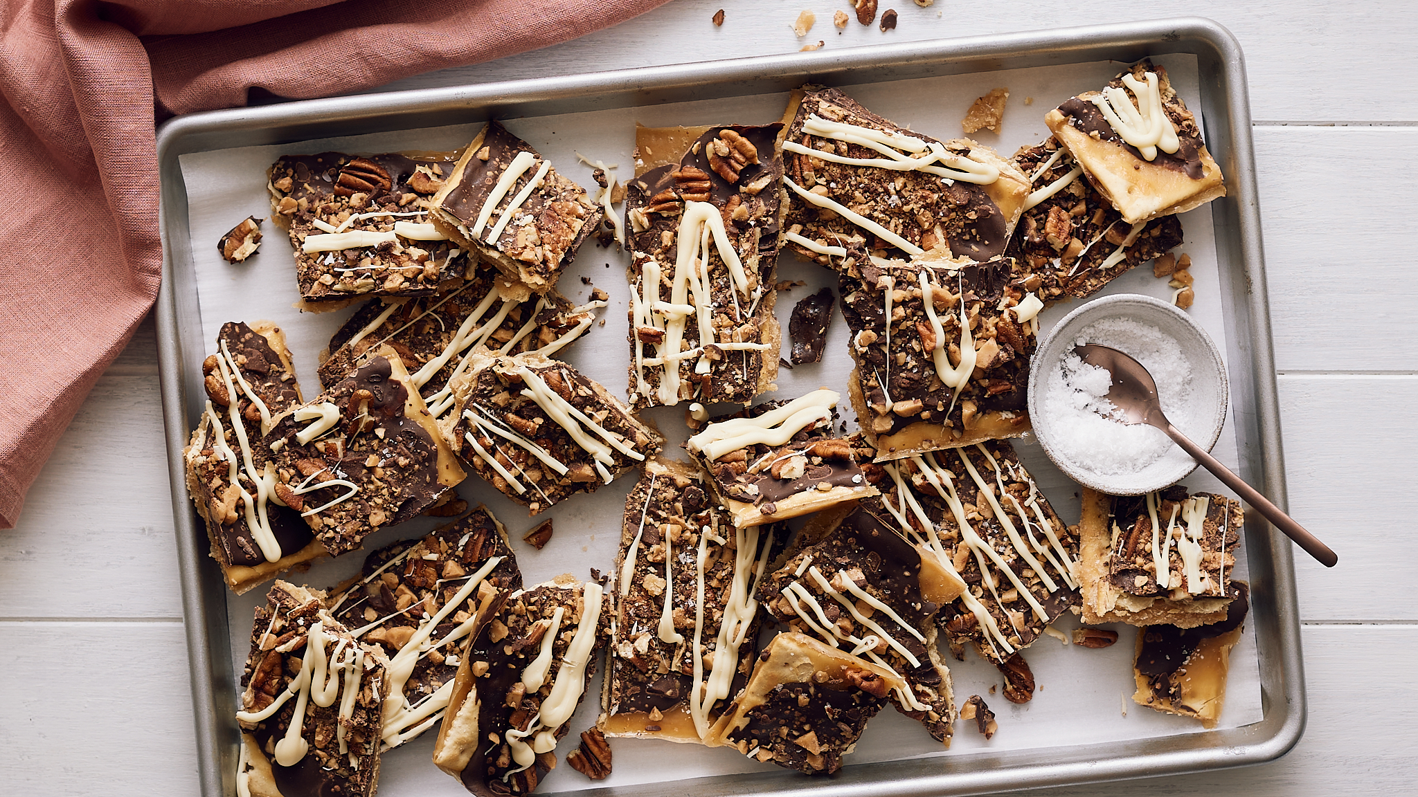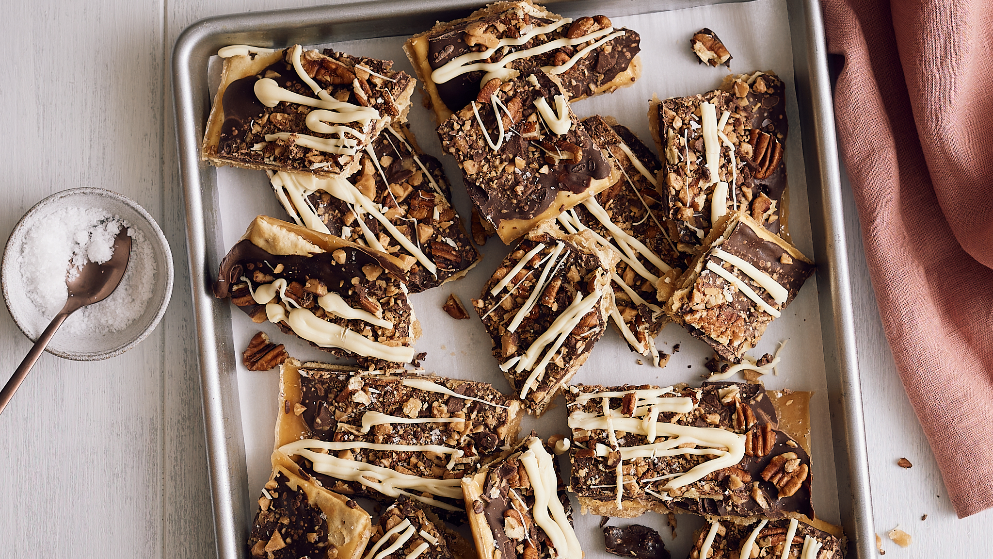 Step 11 -Sprinkle the Toffee Crack with the pecans, the toffee bits, and the flaky salt, then drizzle with the melted white wafers.