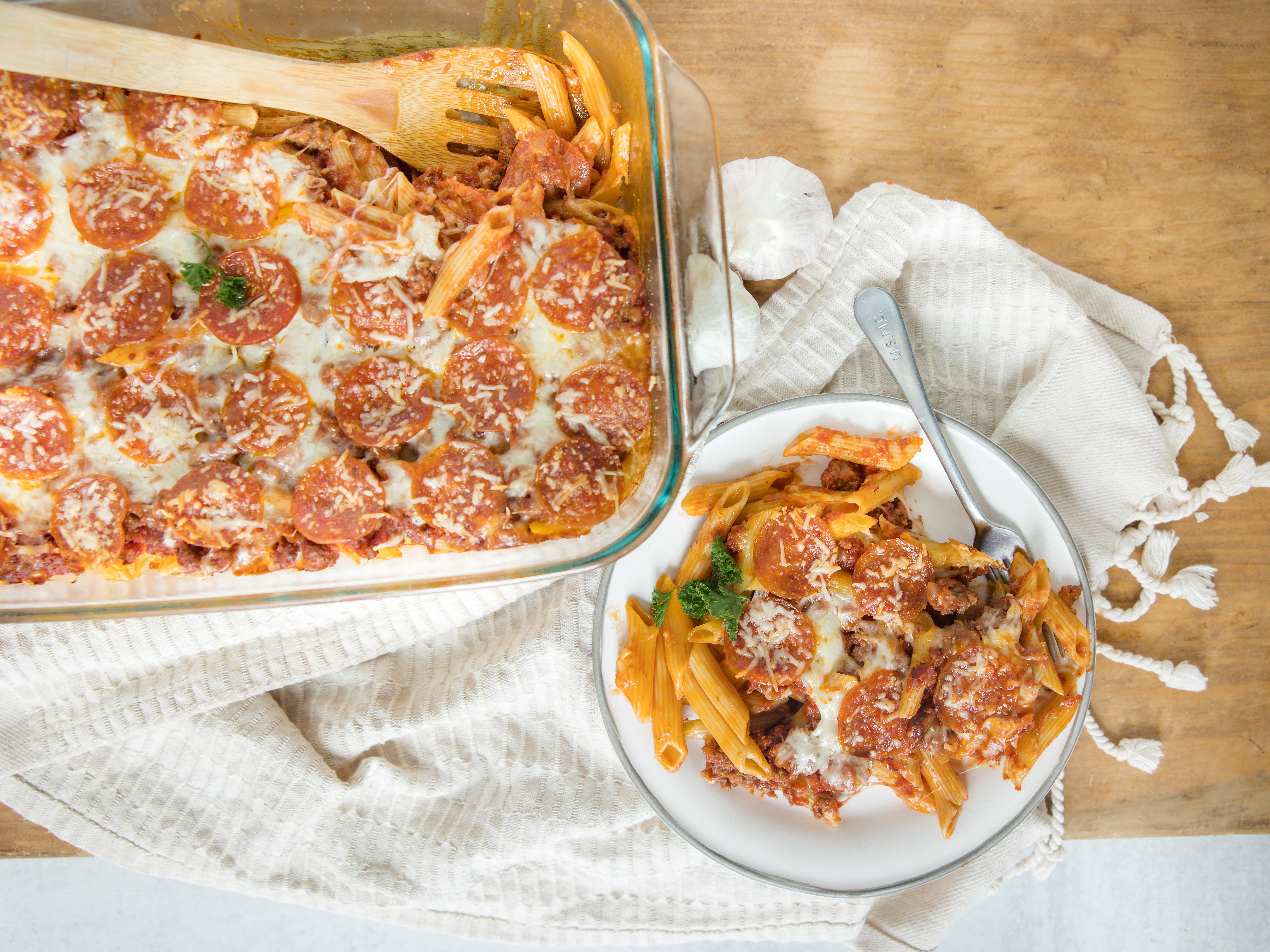 Ahh, the weekend is finally here! What better way to celebrate a little time off than by whipping up this Weekend Pizza Bake? Layered up and bubbling with all of your favorite pizza flavors, you won't be mad for a second that you traded the usual crispy crust for some bouncy penne... it makes for a delicious combination! Weekend Pizza Bake is even cheaper than your go-to takeout pizza, yet will taste even better. What a tasty start this is!