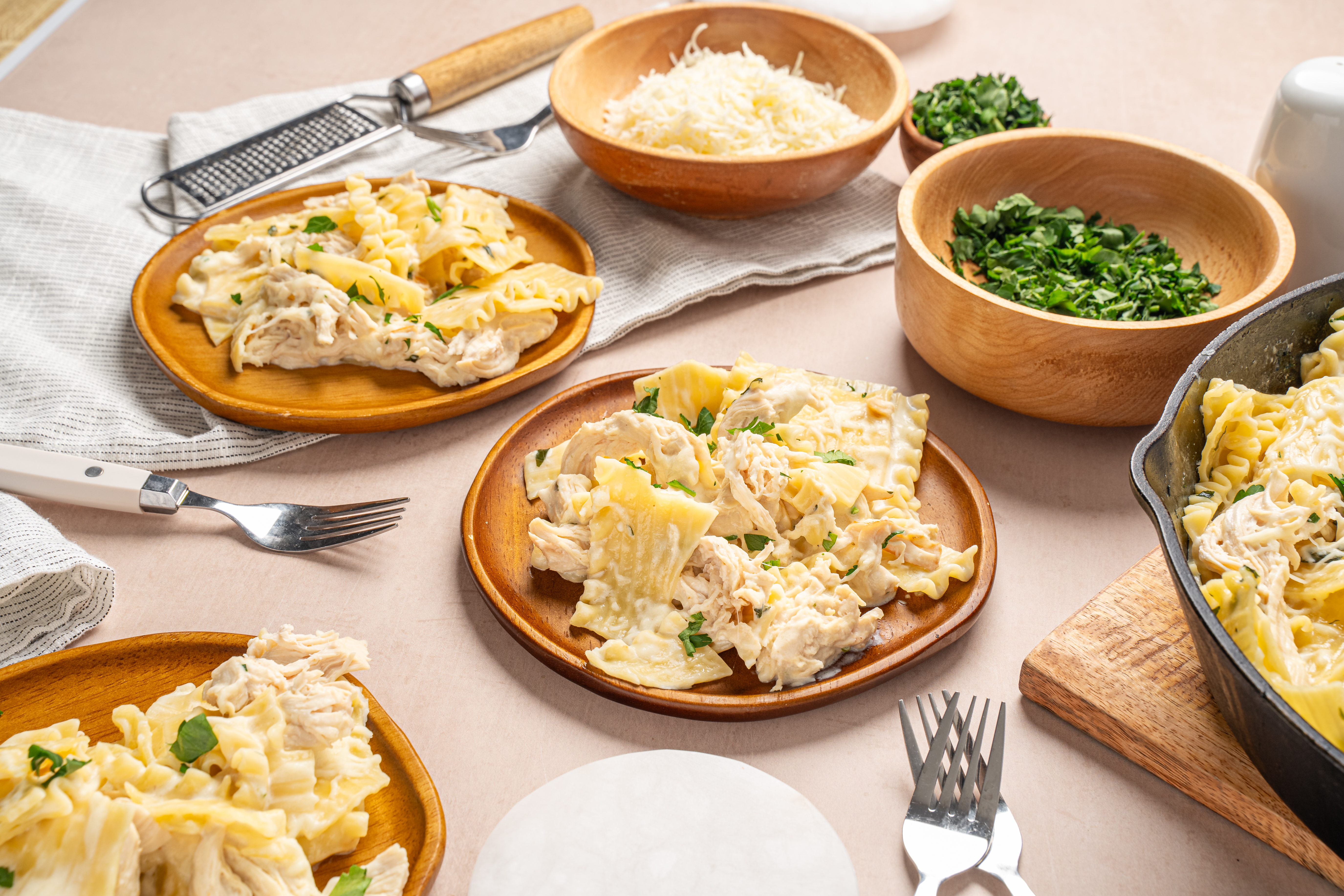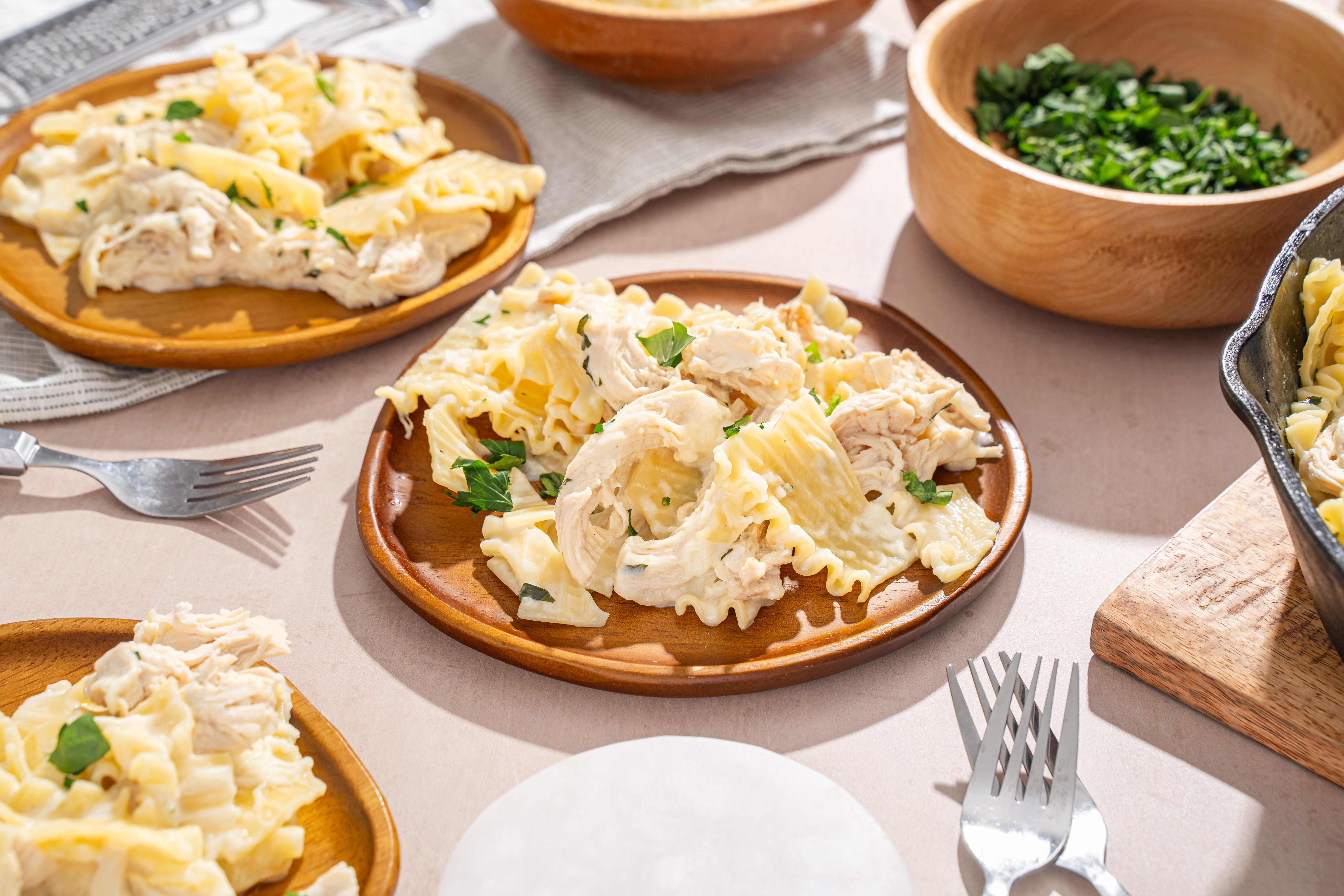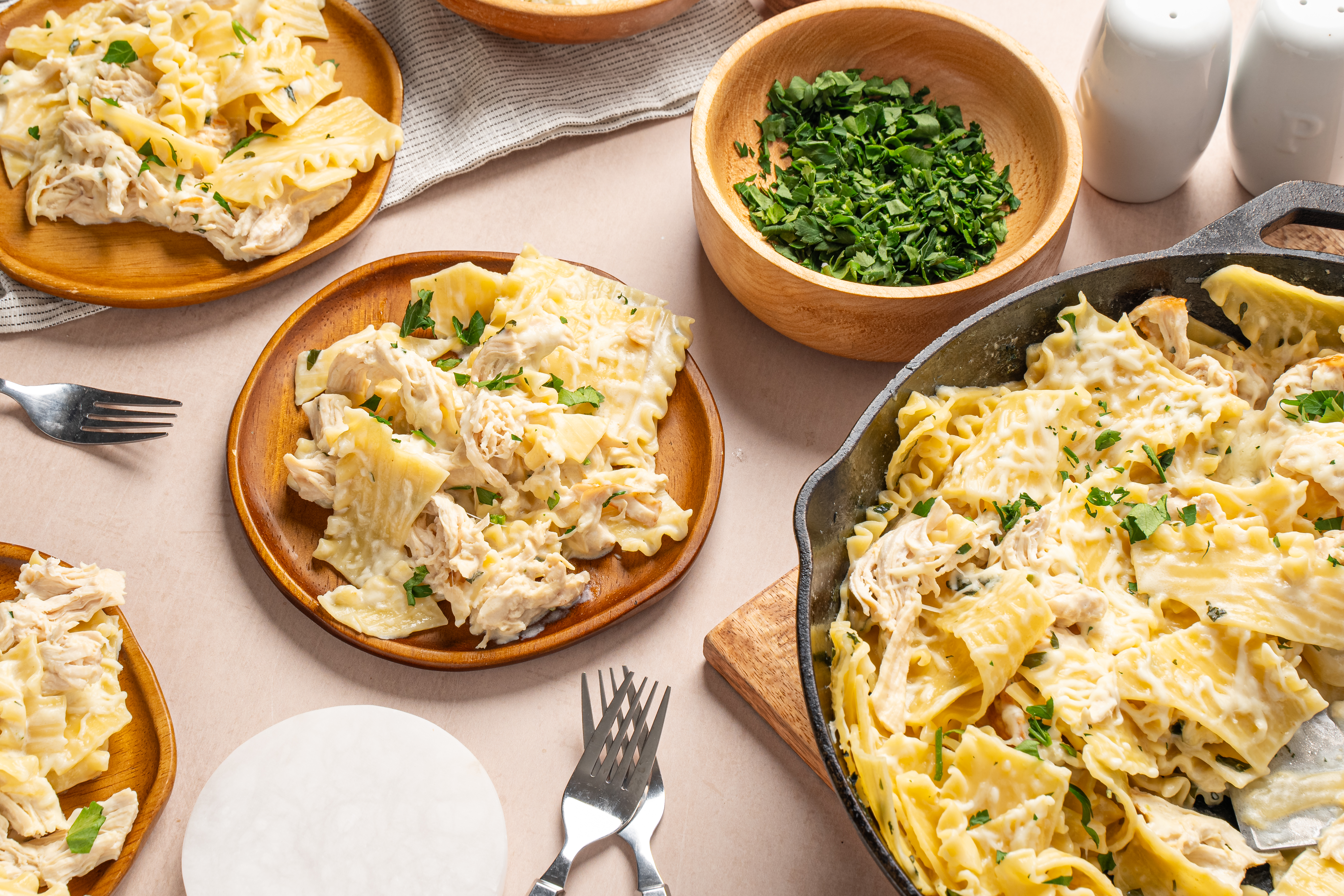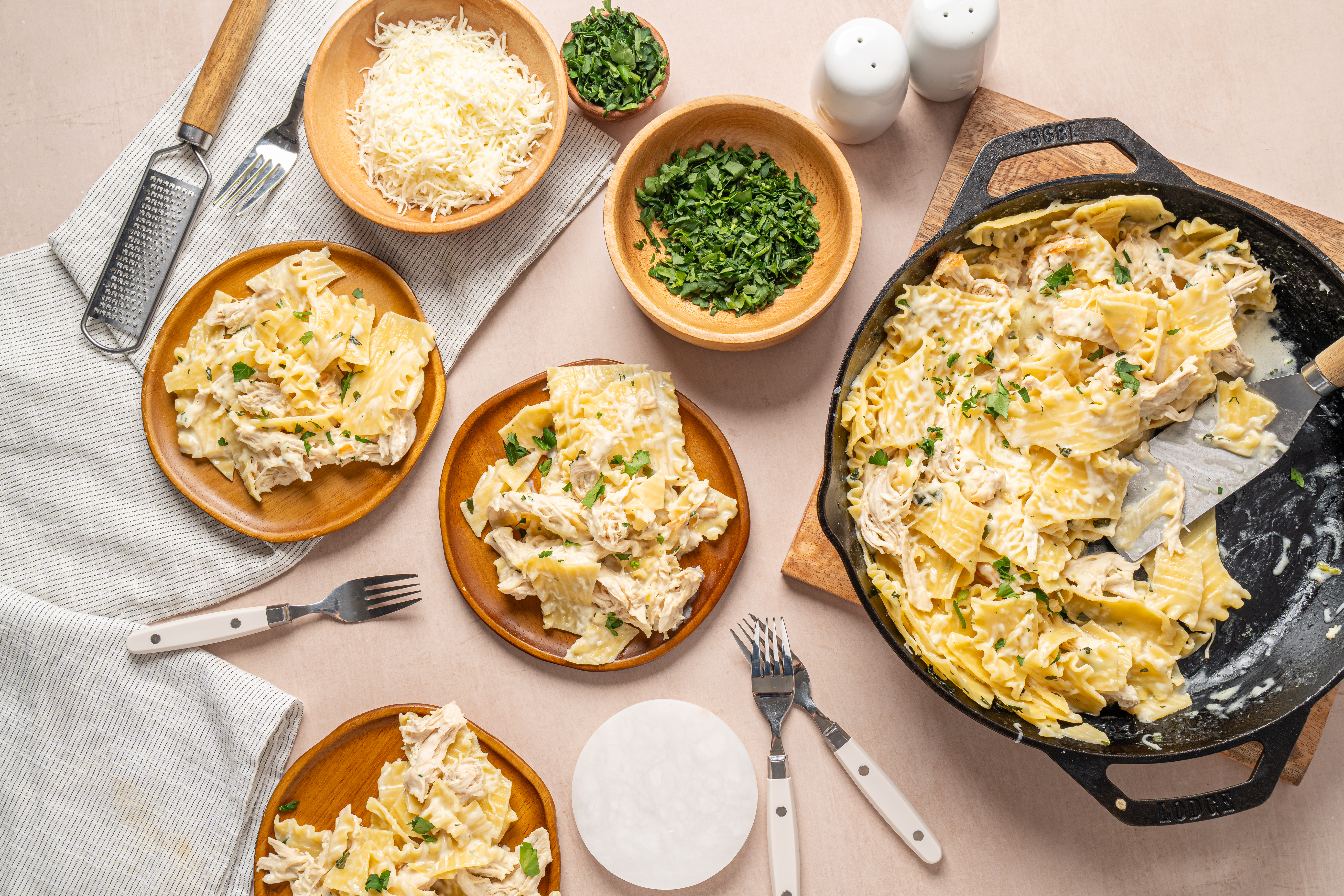 It may not have the layers of a traditional lasagna, but it definitely has the flavor! White Chicken Skillet Lasagna is creamy, savory, and inviting. It brings the sensation of a Sunday dinner in a single skillet. The chicken is golden and wonderfully cooked, the sauce is aromatic and rich, and the noodles are as tender as you imagine! Top it with mozzarella cheese and White Chicken Skillet Lasagna will be taking your taste buds for a wild ride!